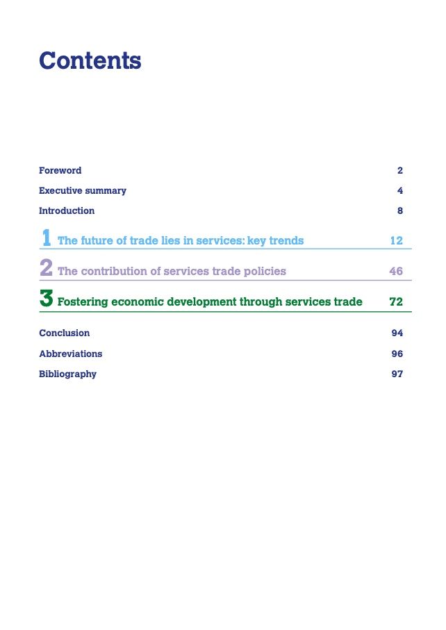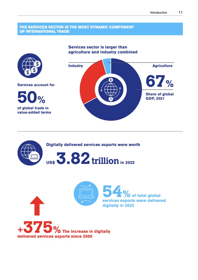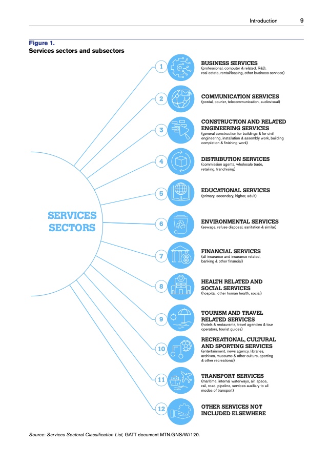 服务业占全球经济活动的最大份额,创造了三分之二以上的国内生产总值,雇用了最多的工人,并且是创造大多数新就业机会的来源,特别是对女性和年轻工人而言。同时,服务贸易已经变成了增长战略的一个关键因素,成为近来全球贸易中最有活力的组成部分,并创造了更高附加值的工作。