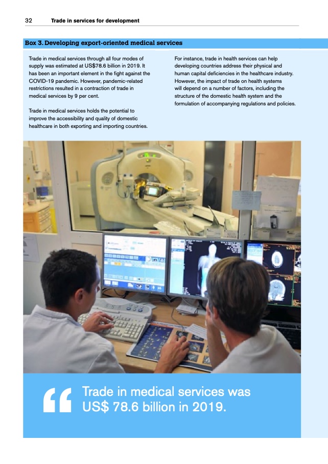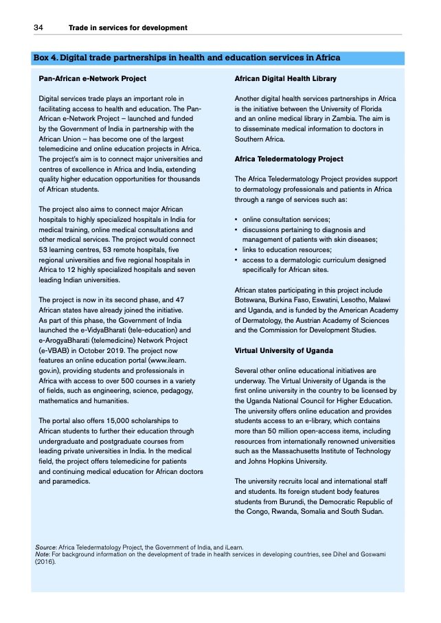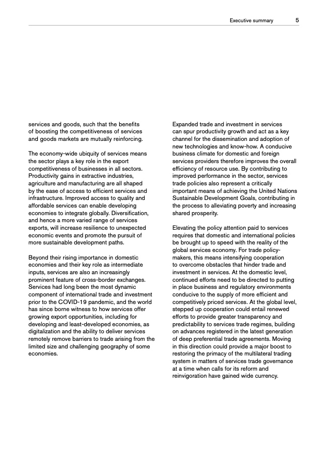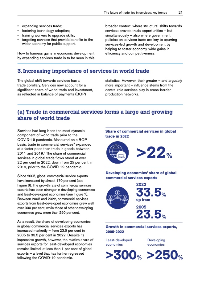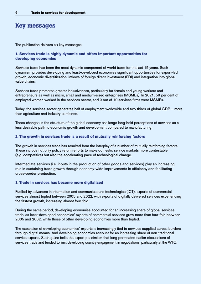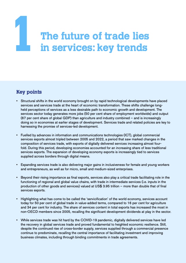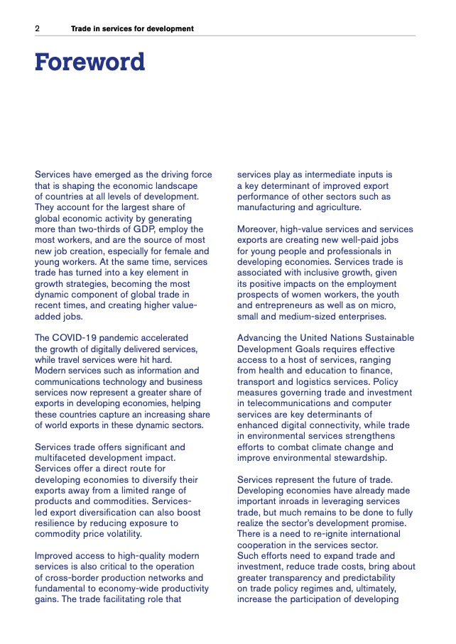 服务业代表着贸易的未来。发展中经济体已经在利用服务贸易方面取得了重要进展,但要充分实现该部门的发展前景,仍有许多工作要做。有必要重新点燃服务部门的国际合作。这种努力需要扩大贸易和投资,降低贸易成本,提高贸易政策制度的透明度和可预测性,并最终增加发展中经济体对服务贸易政策审议和谈判的参与。此外,数据必须能够更自由、更安全地跨境流动,以支持数字贸易,实现包容性和就业的增长潜力。