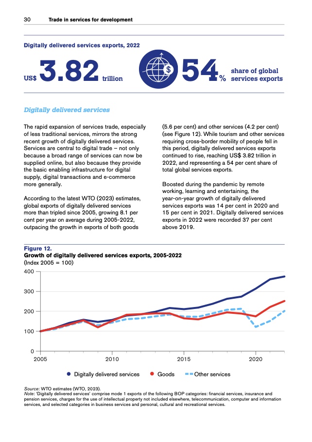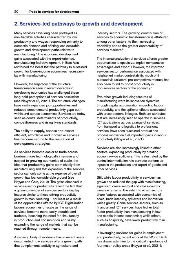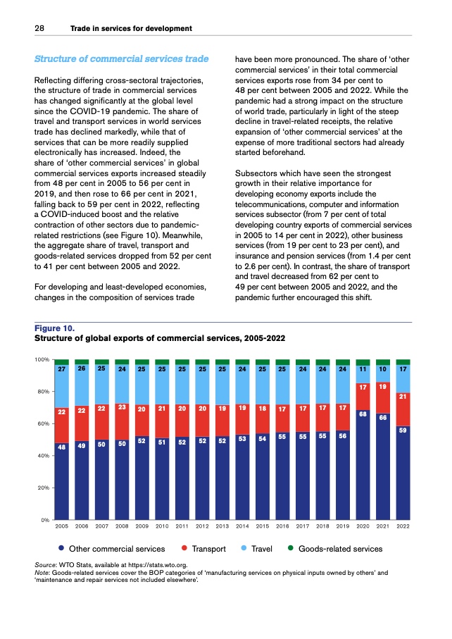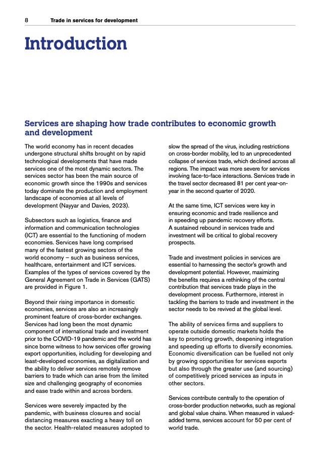 服务贸易提供了重要的和多方面的发展影响。服务业为发展中经济体提供了一条使其出口多样化的直接途径,使其不再局限于有限的产品和商品。以服务为主导的出口多样化也可以通过减少对商品价格波动的影响来提高复原力。