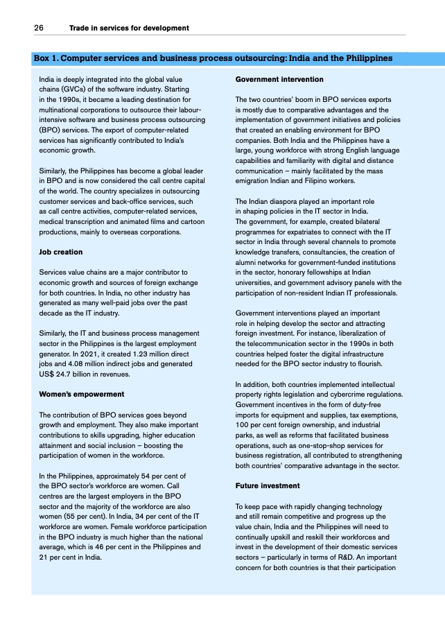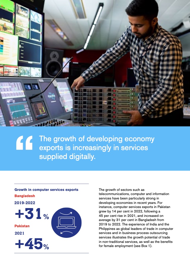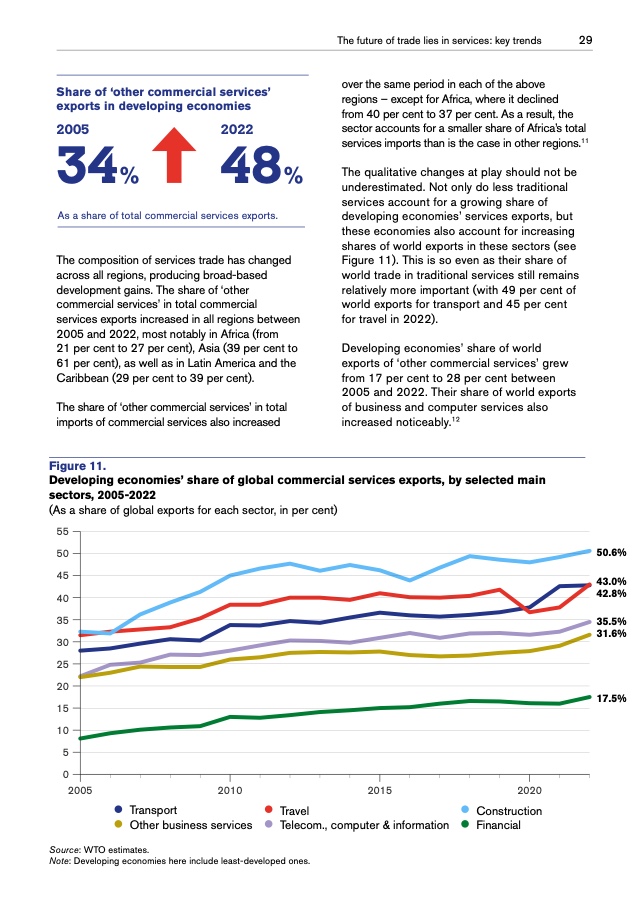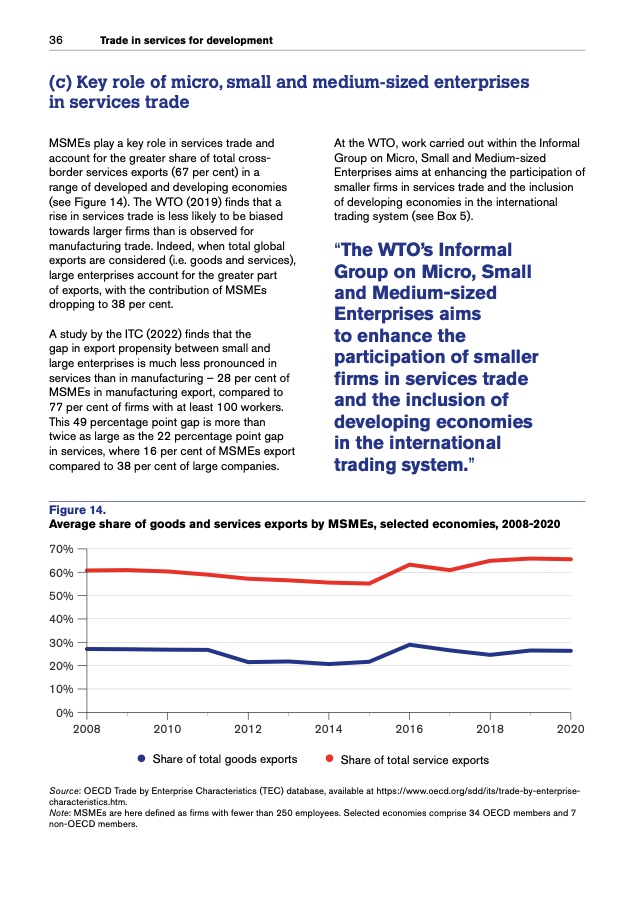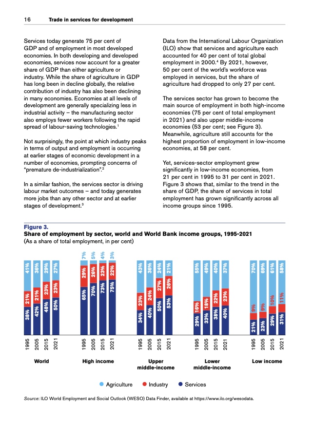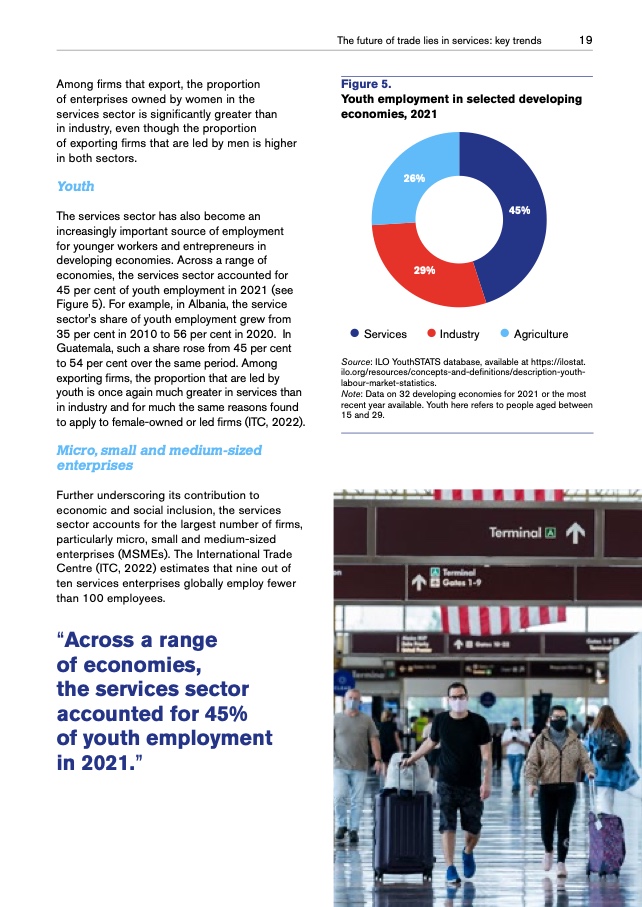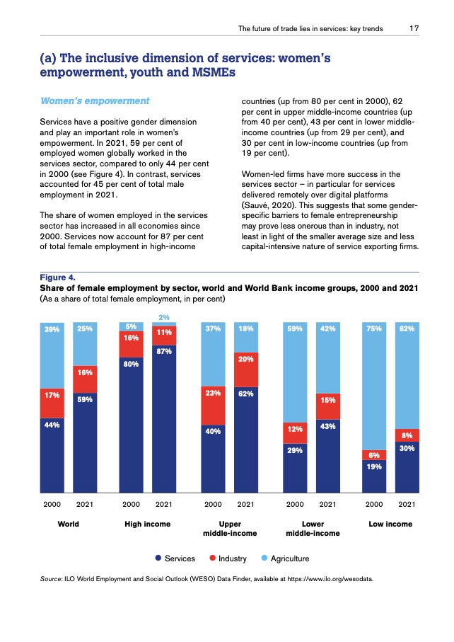 此外,高价值服务和服务出口正在为发展中经济体的年轻人和专业人士创造新的高薪工作。服务贸易与包容性增长有关,因为它对女工、青年和企业家以及微型、小型和中型企业的就业前景有积极影响。