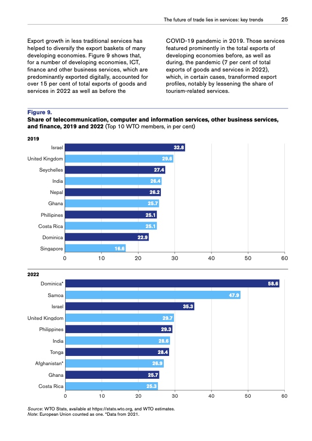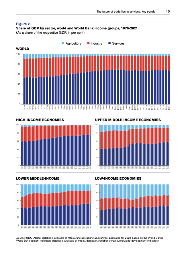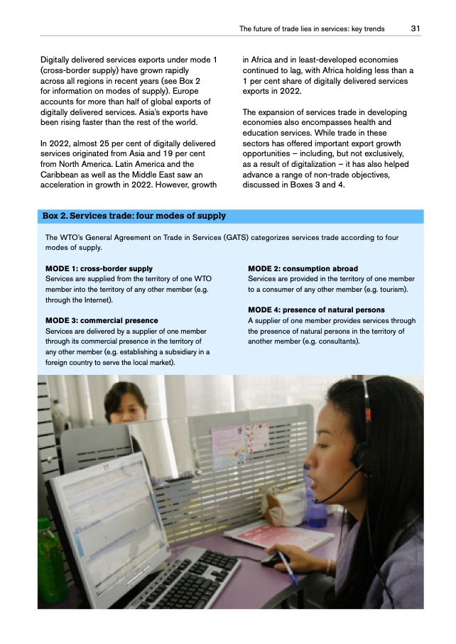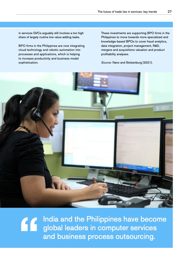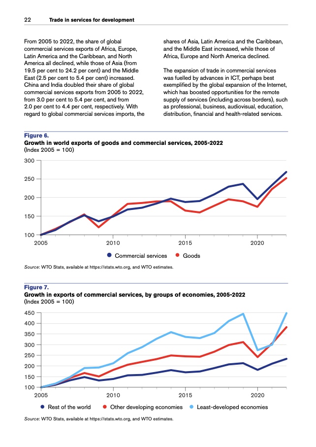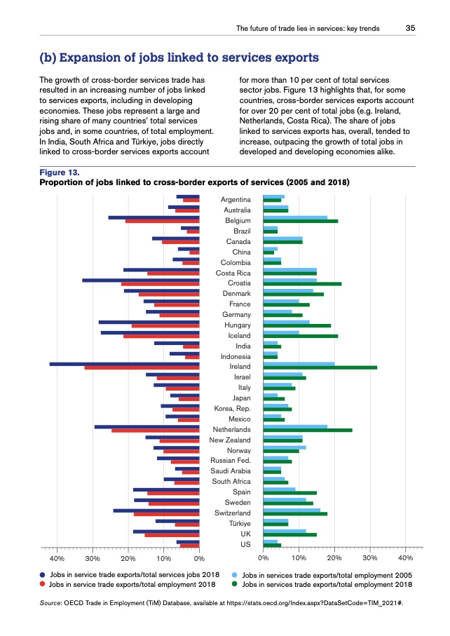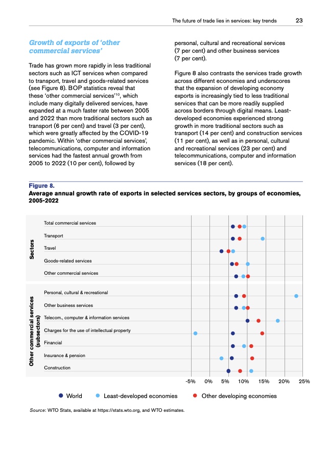 此外,高价值服务和服务出口正在为发展中经济体的年轻人和专业人士创造新的高薪工作。服务贸易与包容性增长有关,因为它对女工、青年和企业家以及微型、小型和中型企业的就业前景有积极影响。