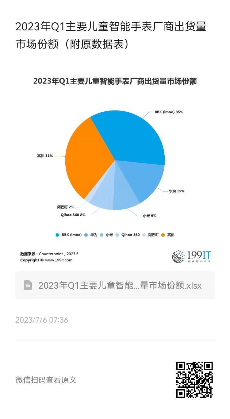 2023年Q1主要儿童智能手表厂商出货量市场份额(附原数据表) ​​​