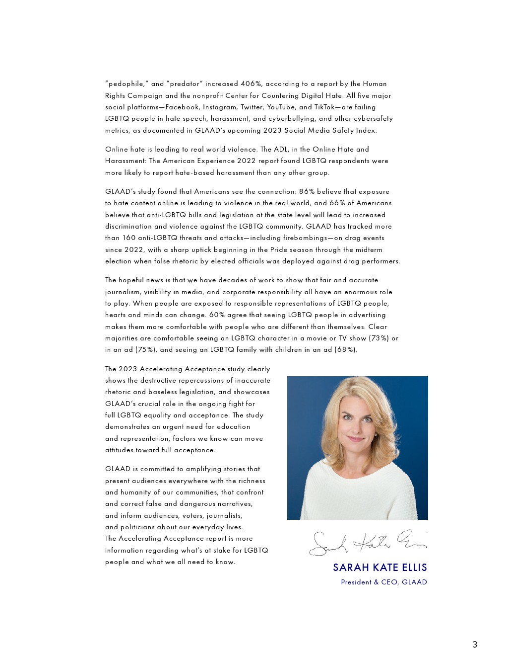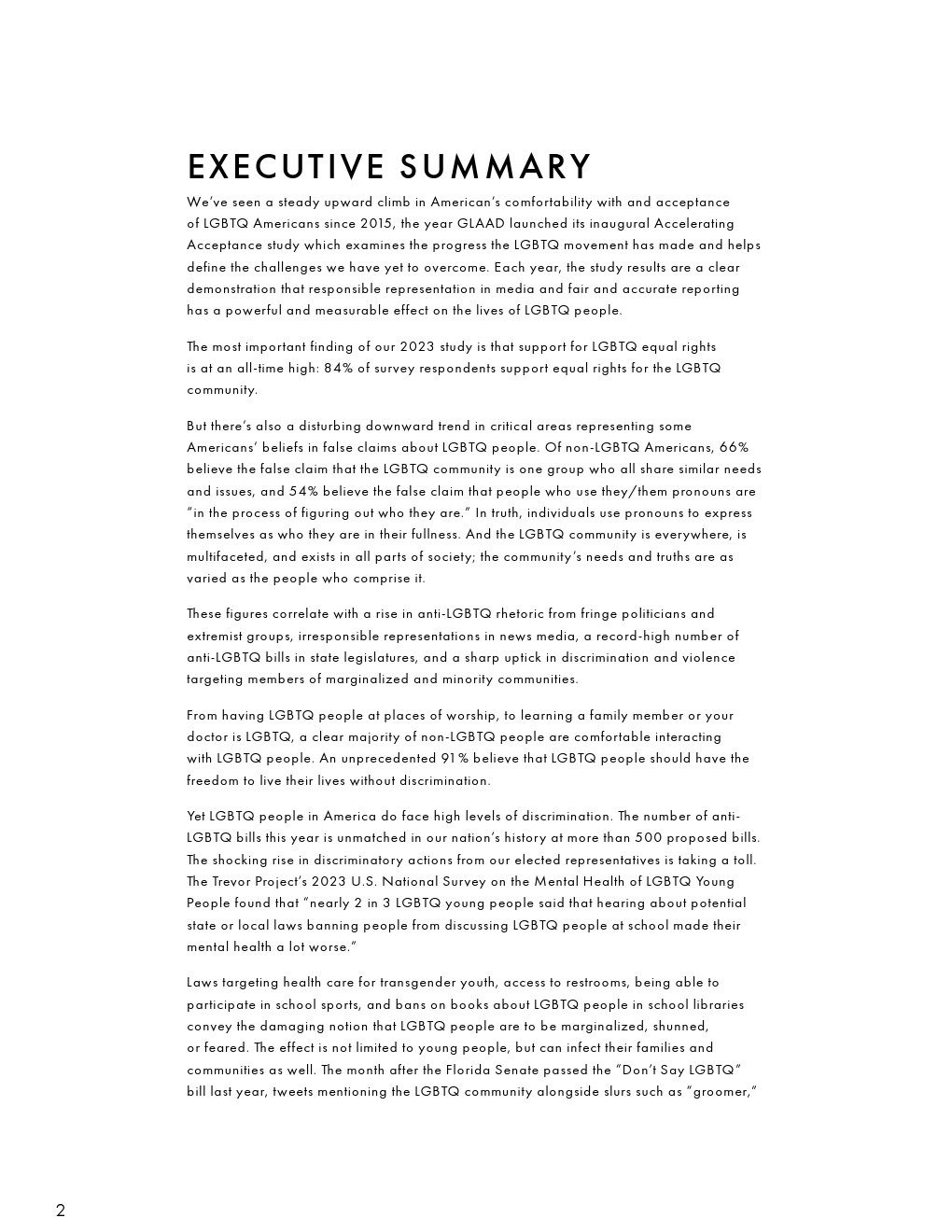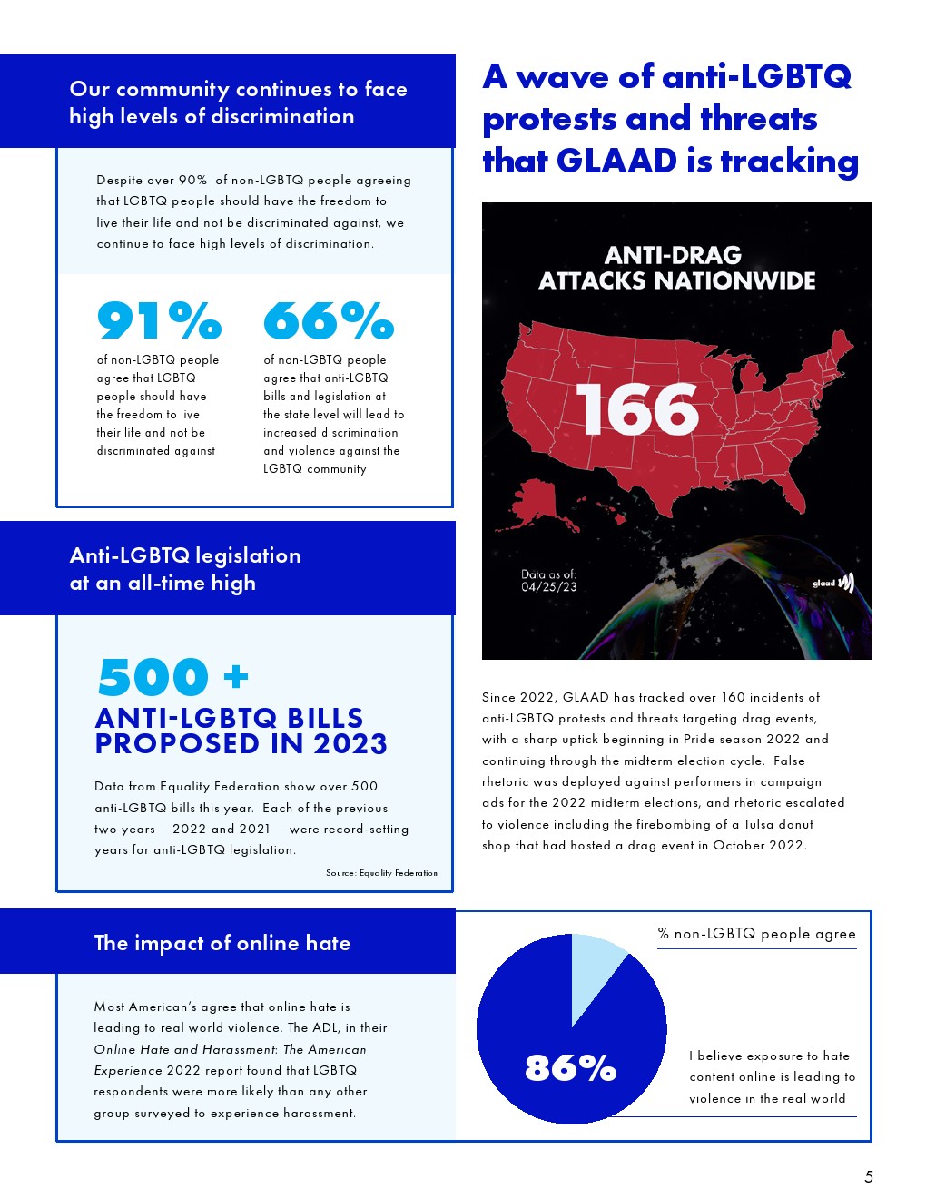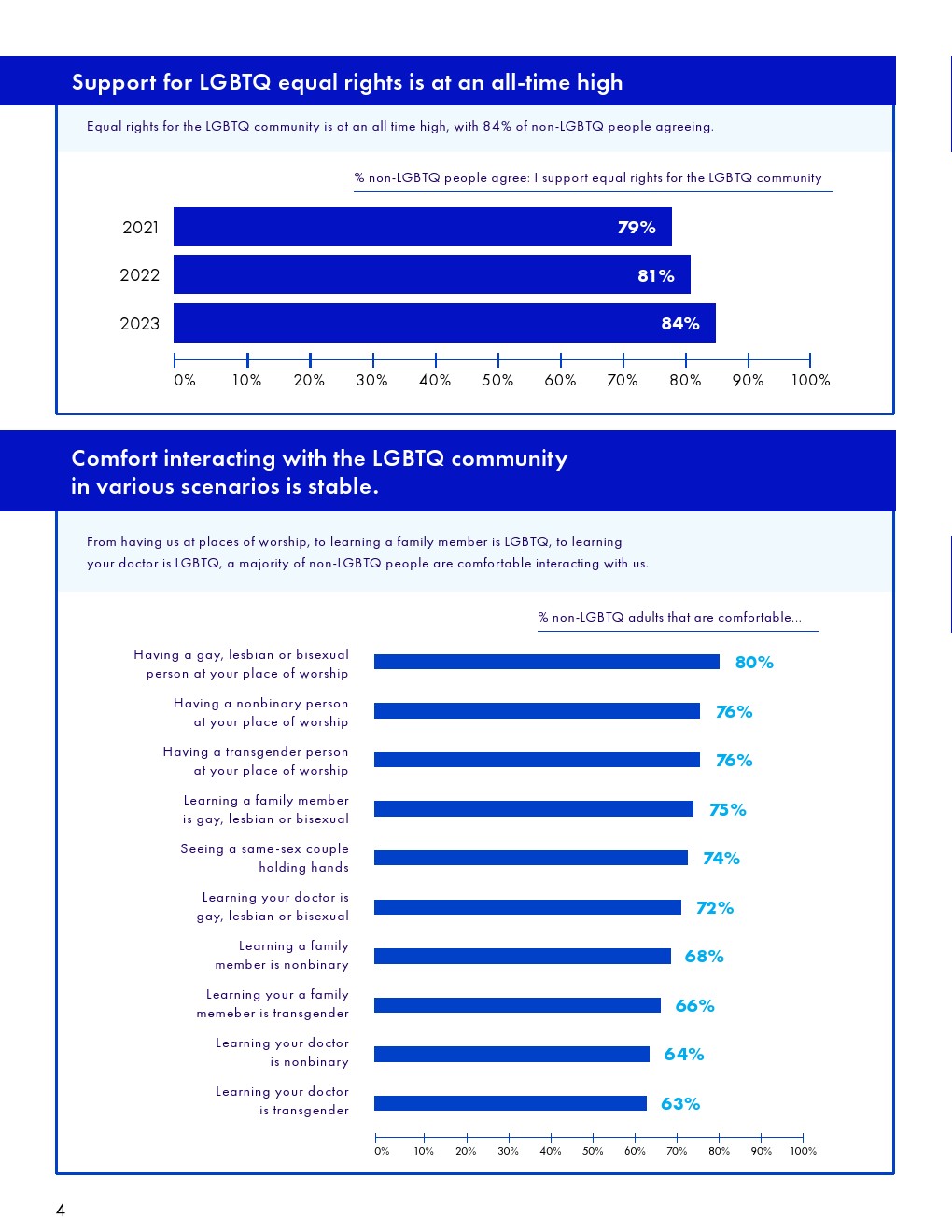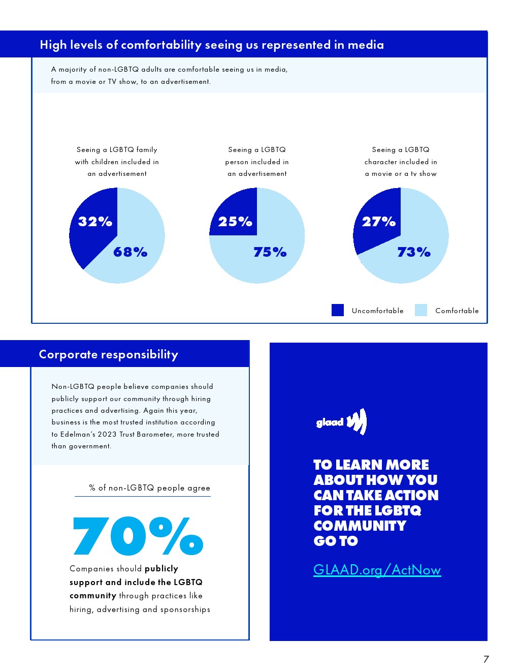 GLAAD的一项调查显示,75%的非LGBTQ成年人对广告中出现LGBTQ人物感到满意, 73%的人对电影或电视节目中出现LGBTQ角色感到满意。此外,68%的人对广告中出现有孩子的LGBTQ家庭感到满意。