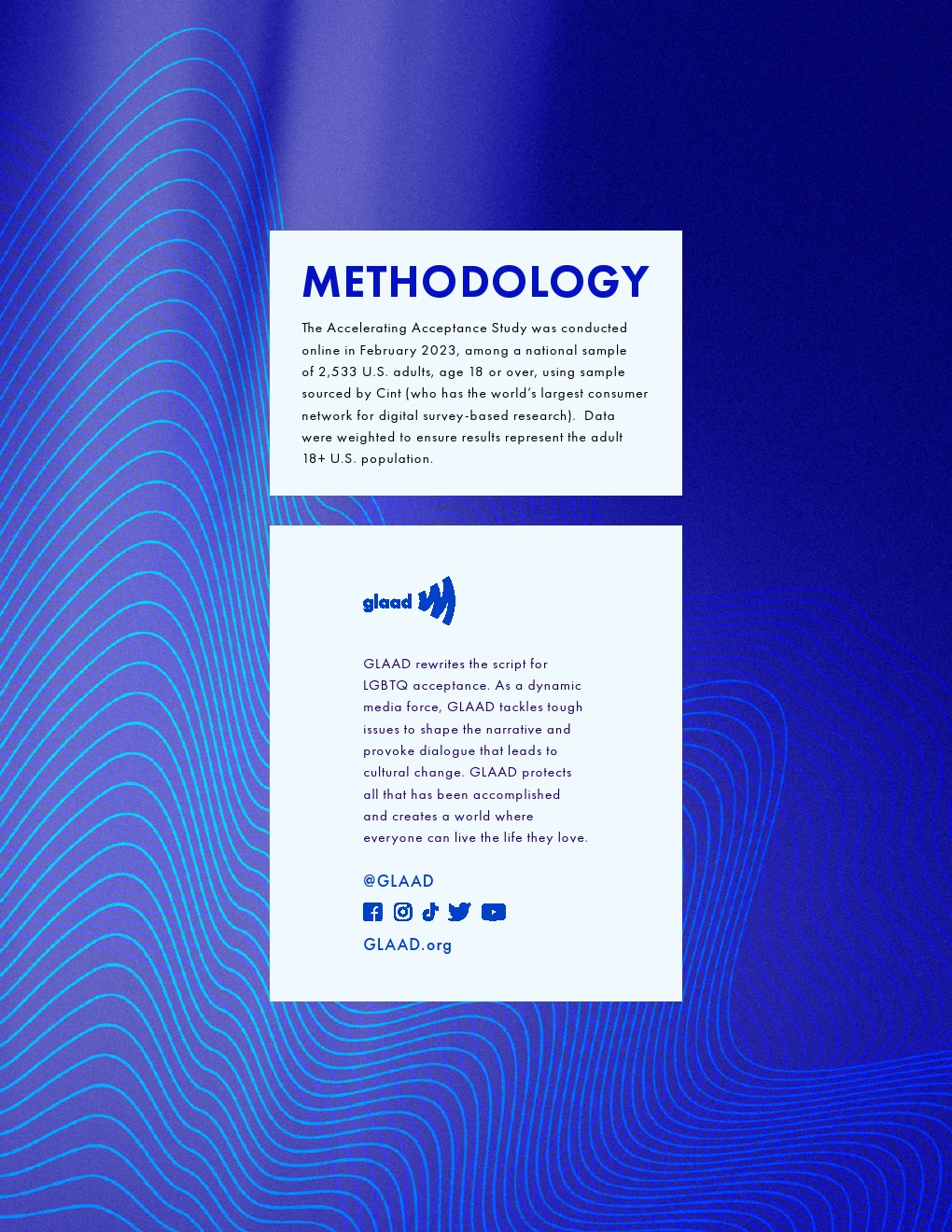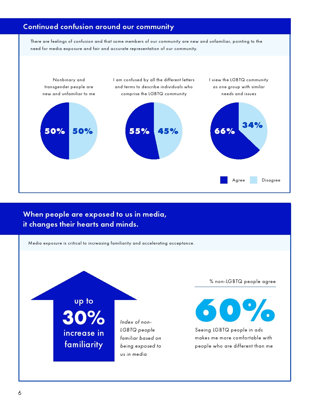 根据GLAAD发布的另一项研究,尽管人们普遍对LGBTQ+在广告中的表现感到满意,并且LGBTQ消费者希望更多地出现在广告中,但他们的知名度仍然很低。GLAAD分析了来自全球排名前十的广告客户的400多条传统电视广告,发现LGBTQ人物或故事只占总屏幕时间的1.42%,在所有436条广告中,只有3%被认为是包容LGBTQ代表的。