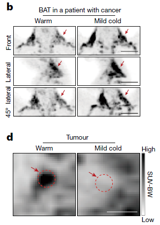 而在唯一的一名癌症患者身上,研究人员对其进行的是为期7天、22℃的更加温和的“低温治疗”,结果还是比较鼓舞人心的:这名患者棕色脂肪区域激活,摄取葡萄糖增加,而纵膈淋巴瘤部位的葡萄糖信号显著降低。