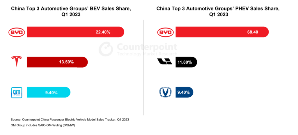 Counterpoint中国乘用电动车车型销量追踪的最新研究显示,2023年第一季度中国乘用电动车*销量年同比增长29%。纯电动车销量占近70%。插电式混合动力车销量年同比飙升88%。近年来,插电式混合动力车在中国日益普及。比亚迪凭借销量增长79%和市场份额年同比增长9.8%,巩固了其领先地位。前十大汽车集团(包括28个品牌)合共占乘用电动车总销量的80%以上。