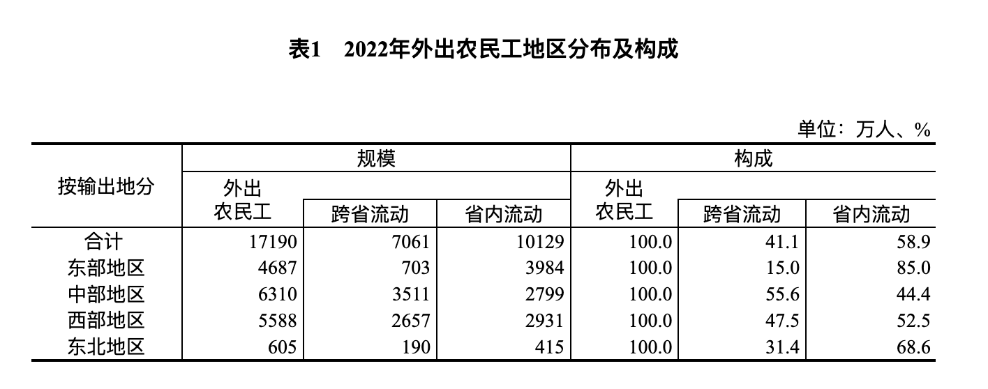 在外出农民工中,跨省流动7061万人,比上年减少69万人,下降1.0%;省内流动10129万人,比上年增加87万人,增长0.9%。从输出地看,中部地区跨省流动农民工占外出农民工的比重为55.6%,西部地区为47.5%,东北地区为31.4%,东部地区为15.0%。