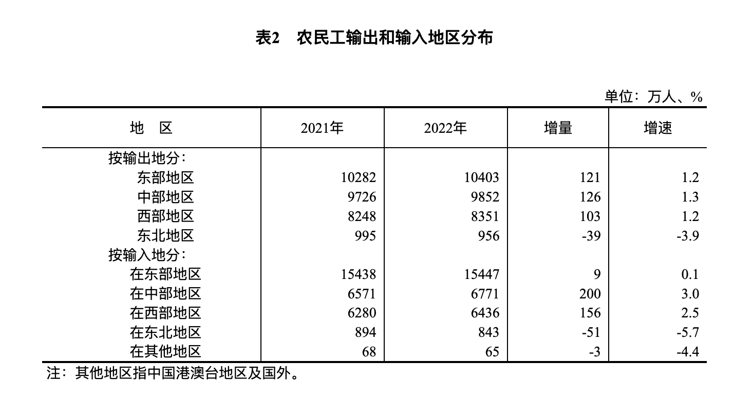 从输入地看,流向中部和西部地区的农民工人数增长较快,流向东北地区的农民工减少。其中,在东部地区就业的农民工15447万人,比上年增加9万人,增长0.1%;在中部地区6771万人,比上年增加200万人,增长3.0%;在西部地区6436万人,比上年增加156万人,增长2.5%;在东北地区843万人,比上年减少51万人,下降5.7%。