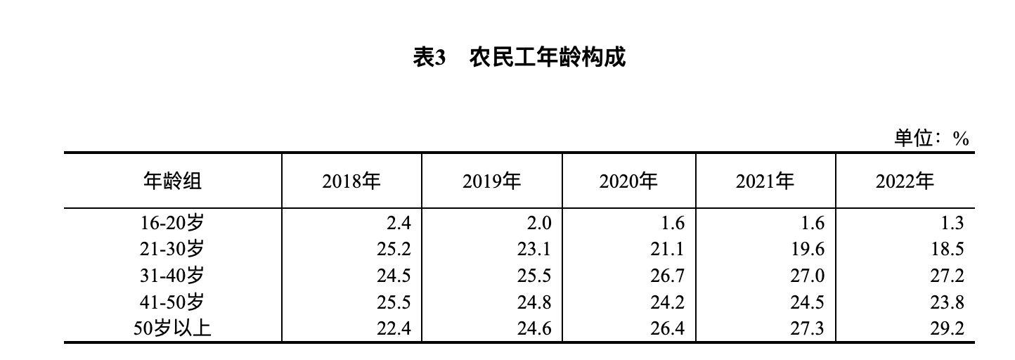 农民工平均年龄42.3岁,比上年提高0.6岁。从年龄结构看,40岁及以下农民工所占比重为47.0%,比上年下降1.2个百分点;41—50岁农民工所占比重为23.8%,比上年下降0.7个百分点;50岁以上农民工所占比重为29.2%,比上年提高1.9个百分点。从农民工的就业地看,本地农民工平均年龄46.8岁,比上年提高0.8岁,其中50岁以上所占比重为41.0%,比上年提高2.8个百分点;外出农民工平均年龄为37.4岁,比上年提高0.6岁,其中50岁以上所占比重为16.4%,比上年提高1.2个百分点。