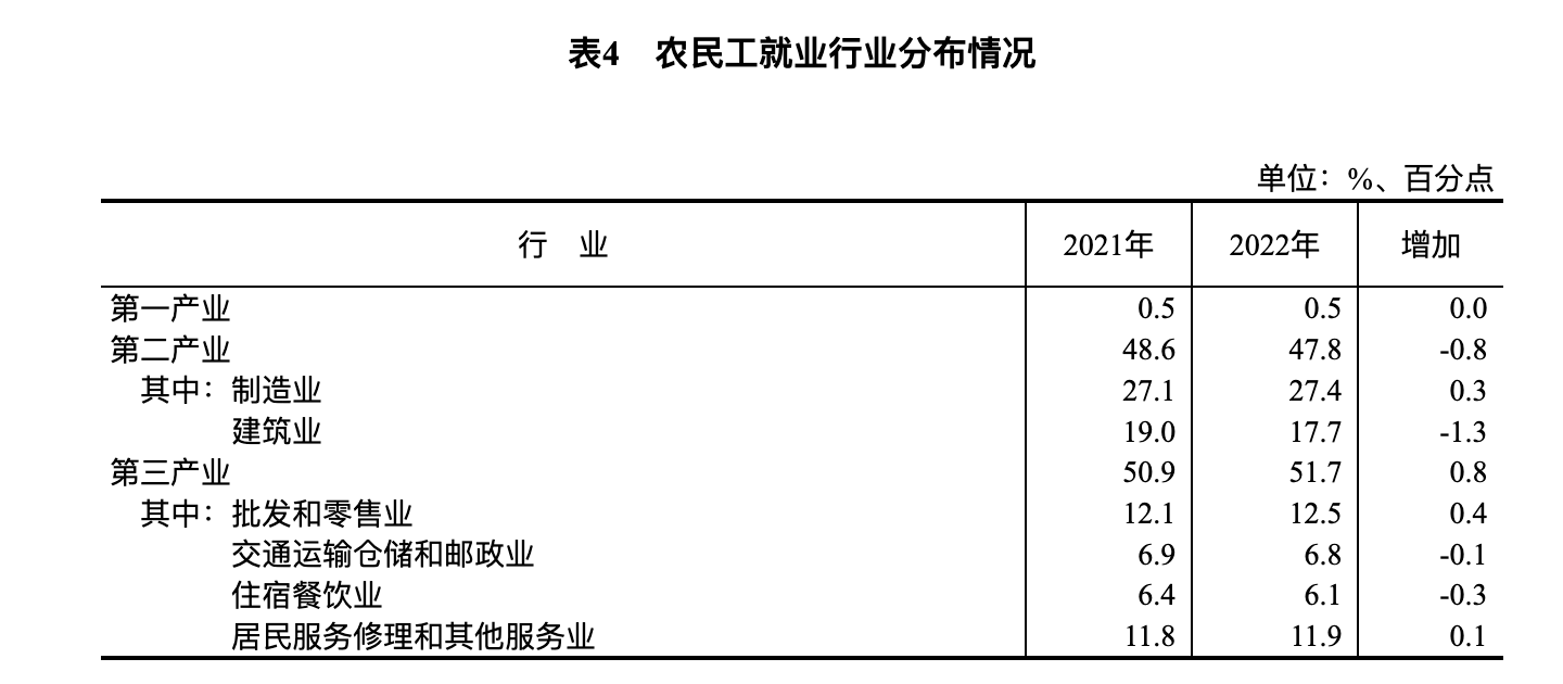 分产业看,99.5%的农民工从事二、三产业。其中,从事第三产业的农民工比重为51.7%,比上年提高0.8个百分点;从事第二产业的农民工比重为47.8%,比上年下降0.8个百分点。