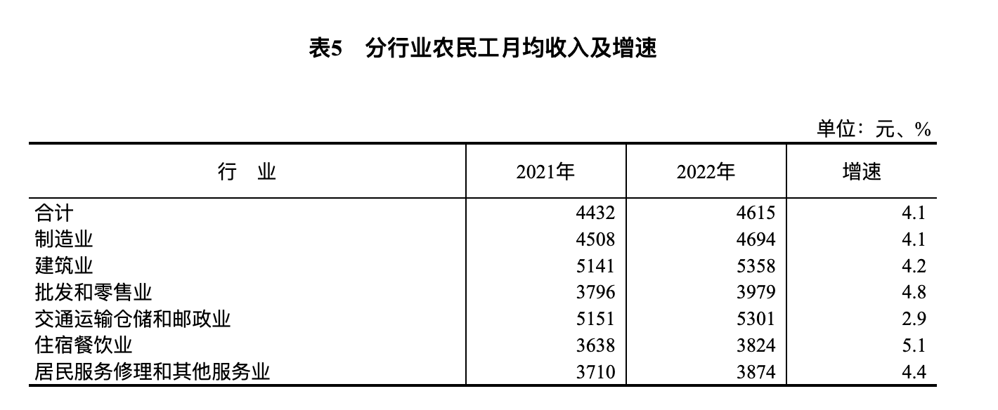 分行业看,六大行业收入均保持增长。从事制造业农民工月均收入4694元,比上年增加186元,增长4.1%;从事建筑业农民工月均收入5358元,比上年增加217元,增长4.2%;从事批发和零售业农民工月均收入3979元,比上年增加183元,增长4.8%;从事交通运输仓储和邮政业农民工月均收入5301元,比上年增加150元,增长2.9%;从事住宿餐饮业农民工月均收入3824元,比上年增加186元,增长5.1%;从事居民服务修理和其他服务业农民工月均收入3874元,比上年增加164元,增长4.4%。
