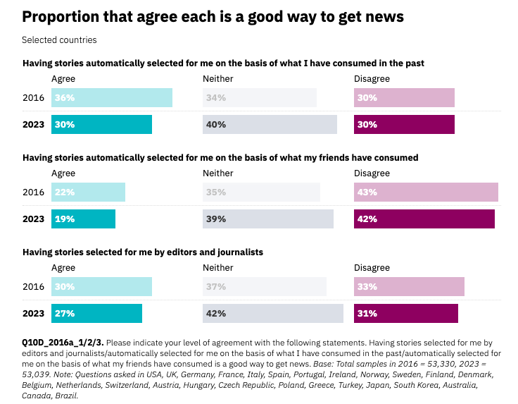 尽管如此,平均而言,用户仍略微更喜欢通过这种方式选择的新闻,而不是由编辑或记者选择的新闻(27%)。