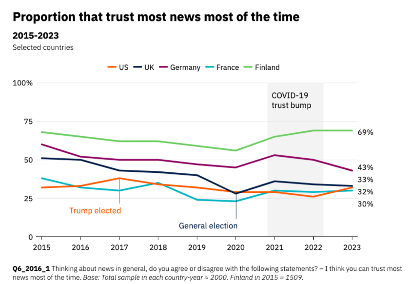 总体样本中,40%的人表示他们大部分时间都对大多数新闻保持信任。芬兰仍然是整体信任度最高的国家(69%),而希腊(19%)则是最低的。美国的新闻信任度增加了6个百分点,但信任度仍然是调查中最低的之一。