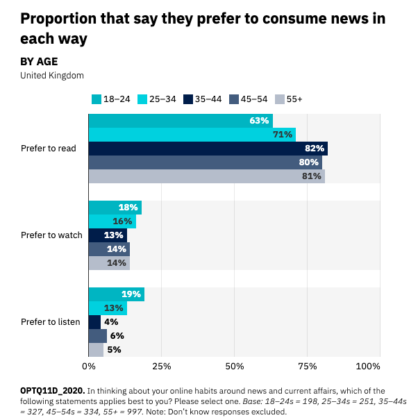 报告调查了新闻用户在在线消费新闻时对文本、音频和视频的偏好。报告显示,平均而言大多数人仍然更喜欢阅读新闻 (57%),而不是观看新闻 (30%) 或收听新闻 (13%),但年轻人(35 岁以下)更有可能收听新闻 (17 %) 高于年长组。