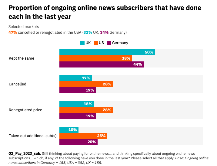 经济衰退对新闻业务模式造成了压力。在线新闻的付费增长在许多市场已经停滞不前,挪威(39%)拥有最高比例的付费用户,而日本(9%)和英国(9%)则最低。超过三分之一的订阅者(39%)表示他们已经取消或重新改变了他们的新闻订阅。生活成本或订阅价格是用户取消订阅的主要原因,缺乏兴趣或价值感匮乏仍然是重要障碍。