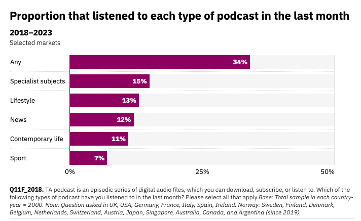 近年来,音频新闻消费一直在增长。新闻播客在受教育程度较高和年轻观众中仍然具有共鸣,但整体上仍然是少数人的活动。根据20个国家的一组调查数据显示,大约三分之一(34%)的人每月使用播客,但只有12%的人访问新闻和时事的播客节目。