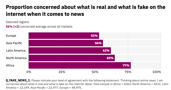 调查显示,超过半数的人(56%)表示,他们在网络上辨别虚假新闻时感到担忧,与去年相比上升了2个百分点。