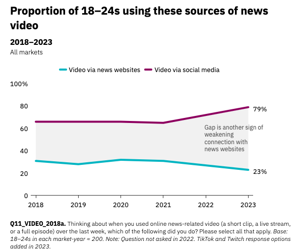 年轻群体通过社交网络消费更多的新闻视频,但不太可能通过新闻网站或应用程序访问视频。下一张图表展示了过去几年 18-24 岁人群如何倾向于社交媒体消费,这一时期恰逢 TikTok 短视频、Instagram Reels 和 YouTube Shorts 的兴起。