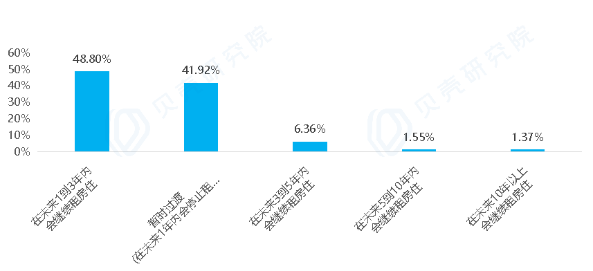 近半数表示未来1-3年内仍会继续租房。通过调研数据显示,有48.8%的租房群体表示未来1-3年仍会选择租房;也有41.92%的租房群体表示目前租房仅是暂时过渡,在未来1年内会停止租房。