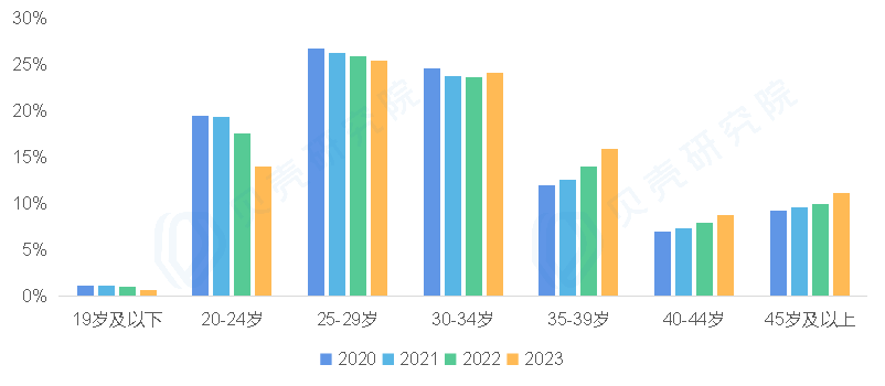 图3:2023年贝壳平台郑州租赁客户年龄段占比变动情况(%)