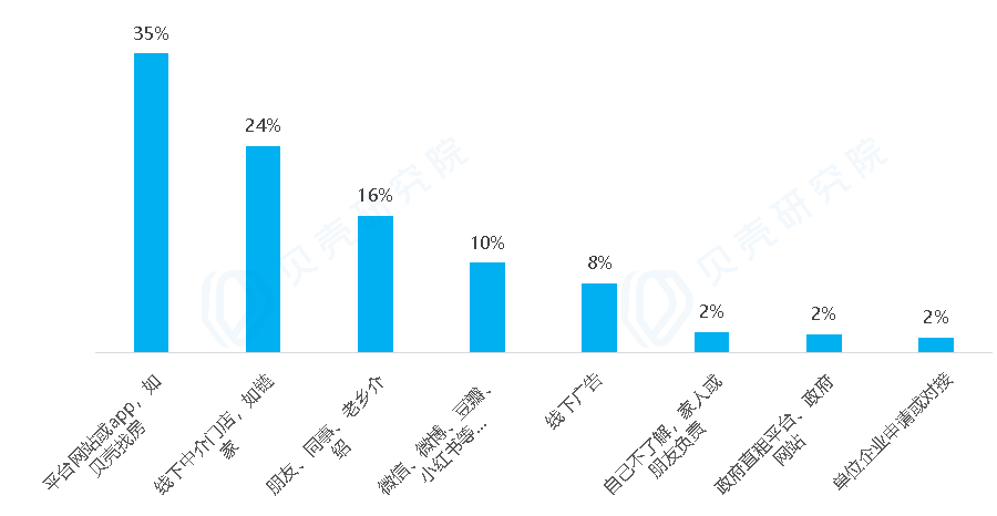 报告的调研结果显示,租房渠道的选择方面,平台类找房APP(如贝壳找房)是人们找房的首要选择渠道。这一现象不因消费者的性别、年龄、收入、学历的不同而发生变化。据本次调研统计,选择平台类网站作为首要租房渠道的占比为35%;其次为线下门店(链家)占比24.19%;再次为朋友、同事、老乡介绍,占比16.01%。