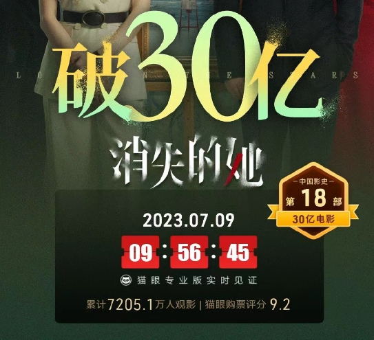 虽然电影《消失的她》在豆瓣评分一路下跌,但丝毫不影响票房的收入。据猫眼专业版数据,《消失的她》上映18天中国大陆累计票房超30亿,超《疾速追杀4》全球票房成绩,进入2023年全球票房榜前10。目前,《消失的她》已超越《中国机长》,跻身中国内地影史第18名,排在前一位的是《我不是药神》(票房31亿)。
