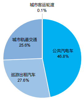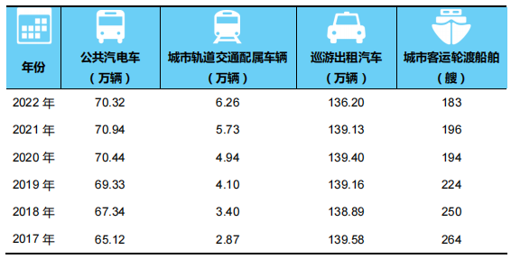 年末全国拥有公共汽电车70.32万辆,比上年末减少0.63万辆,其中纯电动车45.55万辆、增加3.59万辆,占公共汽电车比重为64.8%、提高5.6个百分点。拥有城市轨道交通配属车辆6.26万辆,增加0.53万辆。拥有巡游出租汽车136.20万辆,减少2.93万辆。拥有城市客运轮渡船舶183艘。