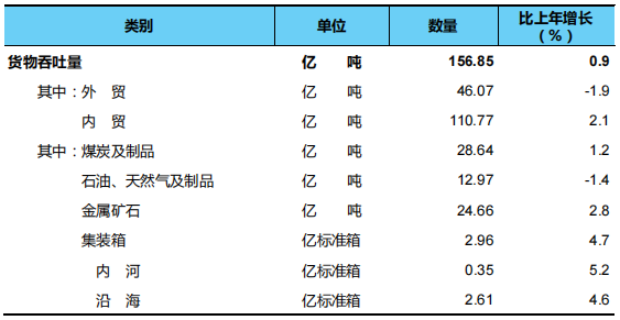 全年完成港口货物吞吐量156.85亿吨,比上年增长0.9%。其中,沿海港口货物吞吐量101.31亿吨、增长1.6%,内河港口货物吞吐量55.54亿吨、下降0.3%;外贸货物吞吐量46.07亿吨、下降1.9%,内贸货物吞吐量110.77亿吨、增长2.1%。完成集装箱吞吐量2.96亿标准箱,增长4.7%。完成集装箱铁水联运量874.70万标准箱,增长16.0%。
