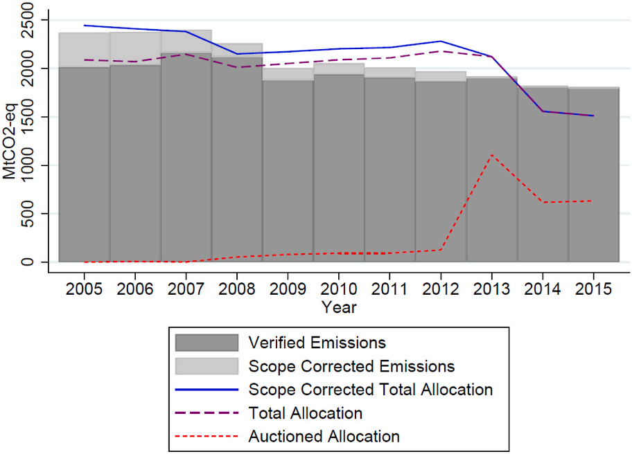 根据EUTL的排放数据绘制了所有受监管设施的排放上限和经过验证的排放量随时间的变化(图2),EUTL是欧盟委员会的集中碳排放清单,记录了所有受监管设施的排放。可以看出,ETS所涵盖设施核实的排放量随时间推移,呈现下降趋势。