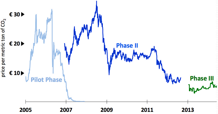 是为期三年的试点阶段,主要为《京都议定书》积累经验、奠定基础。该阶段所限制的温室气体减排许可交易仅涉及CO2,行业覆盖电力及能源密集型工业,并设置了被纳入体系的企业的门槛。在此期间,几乎所有的补贴都免费发放给企业。对超配额排放的企业罚款每吨40欧元。