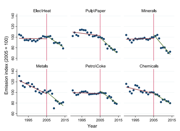 图4显示了EU ETS覆盖的六个主要部门的排放趋势。可以看出,在ETS实施后,每个行业的排放量下降得更快。但文章强调,不能因此说ETS导致了排放量的下降,因为有可能是由其他因素驱动的,特别是2009年的全球金融危机,与所有行业的排放量大幅下降密切相关。
