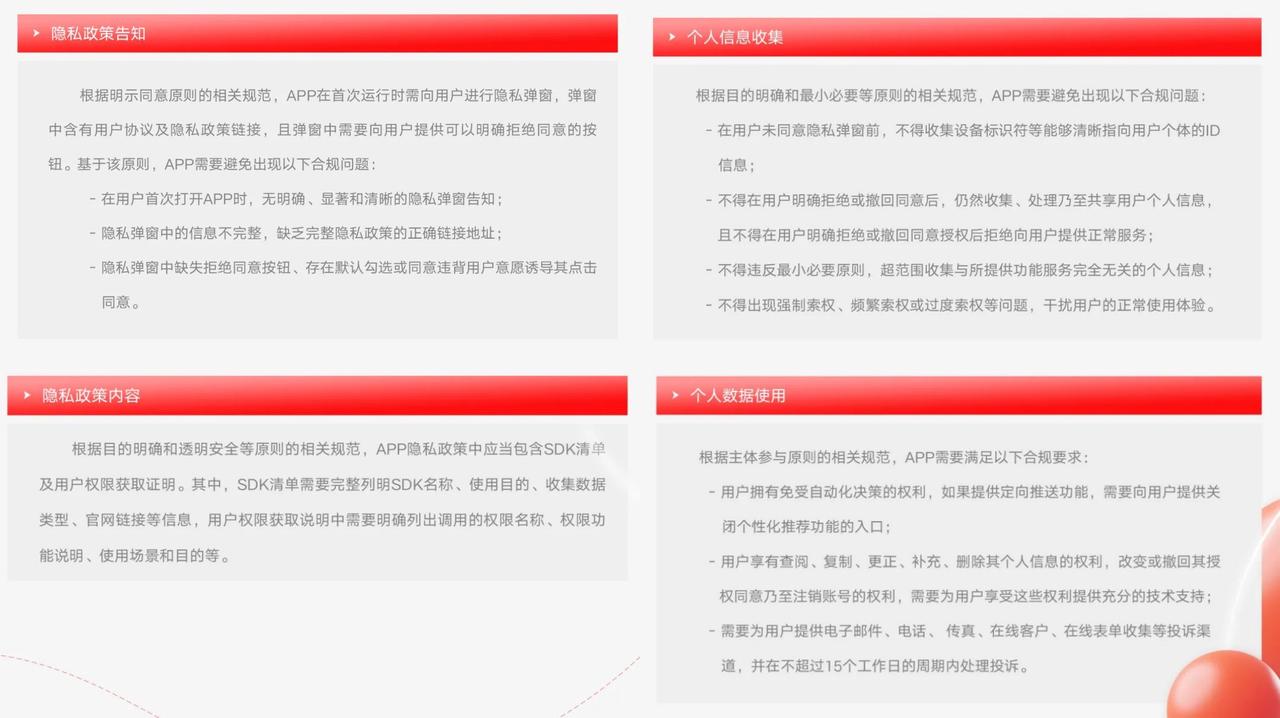 公示隐私政策是保证用户知情权的重要手段,隐私政策应清晰、准确、完整地描述App的个人信息处理行为,并获得用户主动确认同意。因此在隐私政策告知、隐私政策内容、个人信息收集、个人数据使用几方面,需严格遵循明示同意、透明安全、目的性、必要性与最小范围等基本原则,避免出现违规问题。