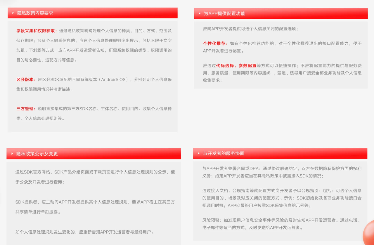 SDK作为第三方主体,多样化的应用场景使得其数据流向更加复杂,潜在风险同样不容小觑。在「SDK个人信息保护合规要求」里,要重点关注隐私政策内容要求、隐私政策公示及变更、为APP提供配置功能、与开发者的服务协同四方面,严格落实法定原则和合规路径。
