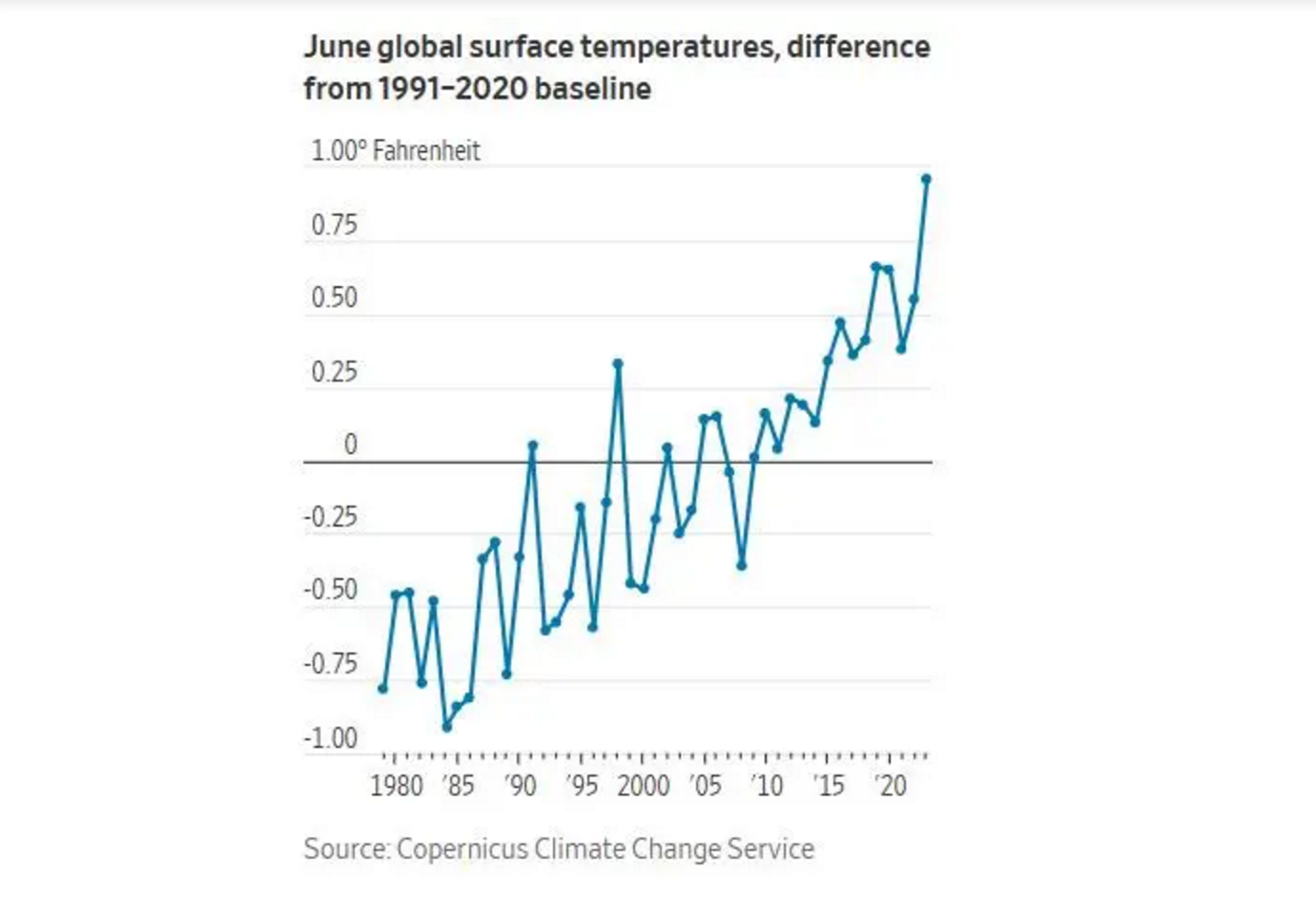 上个月,全球大气温度比1991-2020年的平均温度高出0.95华氏度,超过了2019年6月的记录。根据该机构的数据,欧洲的温度异常更高,超过平均温度1.3华氏度。报告称,2023年6月是有记录以来最炎热的6月。