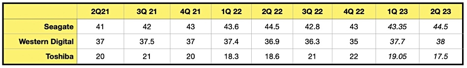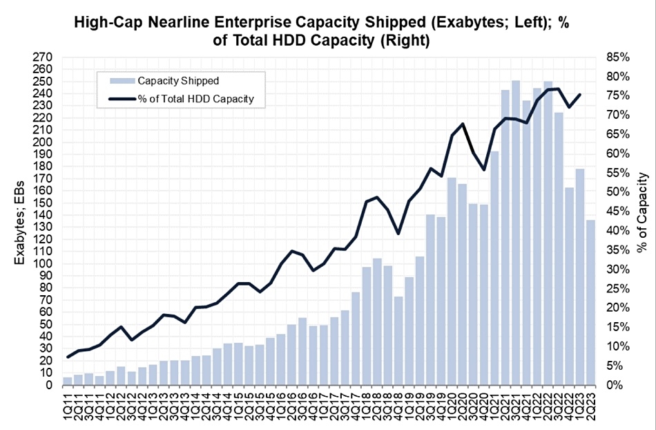 TrendFocus:2023年Q2机械硬盘的出货量总量为3080万~3220万块之间 同比下滑20.2% 最新数据表明,机械硬盘的出货量再次“塌方”。富国银行分享了TrendFocus统计的2023年二季度机械硬盘销售报告,当季总量为3080万~3220万块之间,比去年同期下滑了20.2%。 虽然相较于前一季度33.5%的降幅来说有所收敛,可情况依然不容乐观。 品牌方面,东芝的份额被希捷和西部数据蚕食,二季度结束仅仅剩下17.5%,出货量大概在540万块左右。 分析师研判后认为,目前已经进入SSD大肆搅弄风云的第四个年头,除了近线存储,消费市场的SSD出货已经远超机械硬盘。 如今,只有那些大的OEM、大客户们,还在顽固坚守机械硬盘。 自 快科技 更多阅读:TrendFocus:2023年Q1机械硬盘三大品牌共出货机械硬盘3350-3490万块 同比大跌33.9-36.5%Backblaze:2022年Q2计算机硬盘故障率统计数据 希捷的14TB硬盘故障率平均为5.7%巴克莱银行:预计2022年Q2 HDD硬盘销量会下滑6%Trendfocus:2021年Q2全球SSD固态硬盘总出货为9960万块 比同期的机械硬盘多出47%Trendfocus:2021年Q1消费级PC机械硬盘出货量3497万块 占比仅为41%Trendfocus:2020年全球机械硬盘出货量超2.5亿块 同比下滑18%Trendfocus:2021年Q2机械硬盘出货容量达到350.7EB 创历史纪录Backblaze:2023年Q1硬盘平均故障率为1.54% 同比增长0.32%希捷财报:2023财年Q2希捷营收达18.8亿美元 净亏损3300万美元 同比由盈转亏TrendFocus:2021年Q3企业SSD出货量三星份额高达53.6%TrendFocus:2020年全球SSD总出货量为3.3亿块 同比增加20.8%Backblaze:2023硬盘实测故障率显示SSD比机械硬盘更可靠TrendForce:2022年笔记本SSD普及率已达92% 预计2023年将提升到96%希捷:截止2021年4月希捷出货硬盘容量超3ZB东芝:2021年东芝硬盘出货量和Exabyte分别增长4%和61%