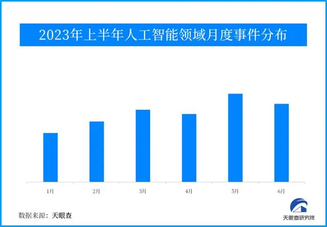 天眼查研究院发布的数据显示,2023年上半年人工智能产业领域月均融资事件达48起。其中,5月融资事件数量位居月度前列,拥有61起;除此之外,6月以及3月以54起、50起位列二、三位。