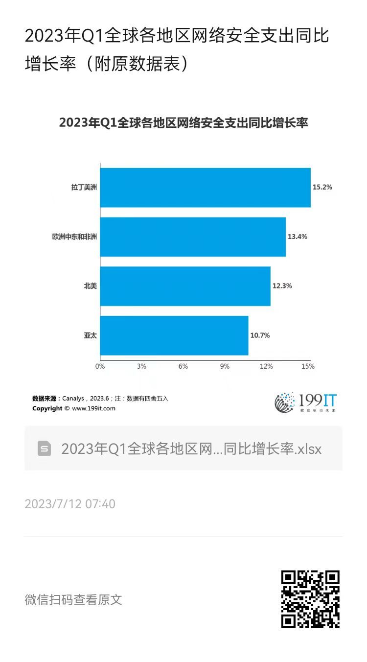 2023年Q1全球各地区网络安全支出同比增长率(附原数据表) 更多阅读:2022年Q1-2023年Q1全球网络安全支出同比增长率(附原数据表) Gartner:2017全球网络安全支出将达864亿美元2026年中国网络安全市场行业占比预测(附原数据表) 2016-2021年全球主要大型科技公司网络安全方面投资额(附原数据表) 2022年Q1全球网络安全支出及增长率(附原数据表) 2023年Q1全球主要网络安全厂商营收同比增长率(附原数据表) 2022年Q3全球各地区网络安全市场收入及增长率(附原数据表) 2023年Q2全球主要地区网络安全支出同比(附原数据表) 2022年Q4-2024年Q1全球网络安全风险投资额(附原数据表) 2022年Q4全球主要网络安全市场支出份额(附原数据表) SANS:2025年ICS/OT网络安全预算弥合网络韧性差距:高管层行动指南HIMSS:2024年医疗保健行业网络安全调查报告Frost:2024年管理检测和响应Think Howe:消费者对欺诈的态度和东南亚移动运营商的机会