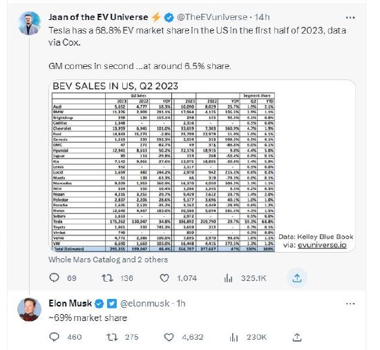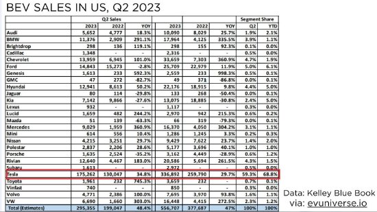 凯利蓝皮书:2023年上半年特斯拉在美国电动汽车市场的市占率达到了68.8% 高居第一 根据凯利蓝皮书的最新数据,今年上半年特斯拉在美国电动汽车市场的市占率达到了68.8%,高居第一,将其他竞争对手远远甩在后面,排名第二的通用汽车仅占据了6.5%的份额。 一位推特用户转发了根据凯利蓝皮书的数据制作的一张图表,上面显示特斯拉第二季度的美国销量达到175262辆,市占率为59.3%;上半年销量达到336892辆,市占率达68.8%。 这张图表成功地吸引了特斯拉CEO马斯克的注意,他在这条推文下回应称:“69%的市占率。” 更多阅读:2023年1-5月特斯拉Model Y在美国市场新注册16.79万辆 同比增长103%特斯拉:截止2023年7月Cybertruck预订量已超过190万辆凯利蓝皮书:2021年Q4美国最受欢迎豪车榜 特斯拉位居第三特斯拉:2025年Q3营收281亿美元,净利润同比下降37%2025年上半年中国高端新能源车特斯拉26.5万辆居首特斯拉:Model Y三年17.5万公里电池健康度94%摩根大通:2025年Q2特斯拉交付量或同比降19%工信部:2025年新能源汽车下乡车型124款,同比增25款乘联会:2025年5月全国新能源乘用车批发销量124万辆 同比增长38%新汽车:2025年4月特斯拉英国销量536辆,同比暴跌62%特斯拉中国:2025年Q1研发投入103亿人民币,Model 3/Y本土化率超95%特斯拉:2025年4月在特斯拉欧洲销售遇冷 瑞典市场锐减81%创两年半新低特斯拉财报:2025年Q1营收193.35亿美元 同比下降9.3%Statista:2025年Q1特斯拉在欧洲销量已经处于崩盘边缘 德国、丹麦、瑞典跌幅超过50%2024年Q1比亚迪纯电销量达41.64万辆 连续两季度超越特斯拉成全球纯电销冠