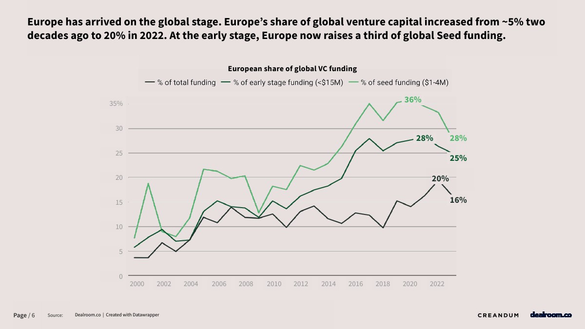 欧洲现在吸引了全球20%的风投资金,而20年前只有5%。它甚至吸引了全球1/3的种子资金。