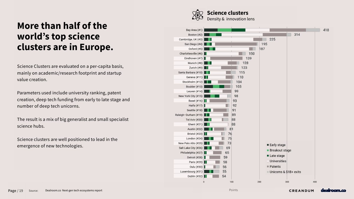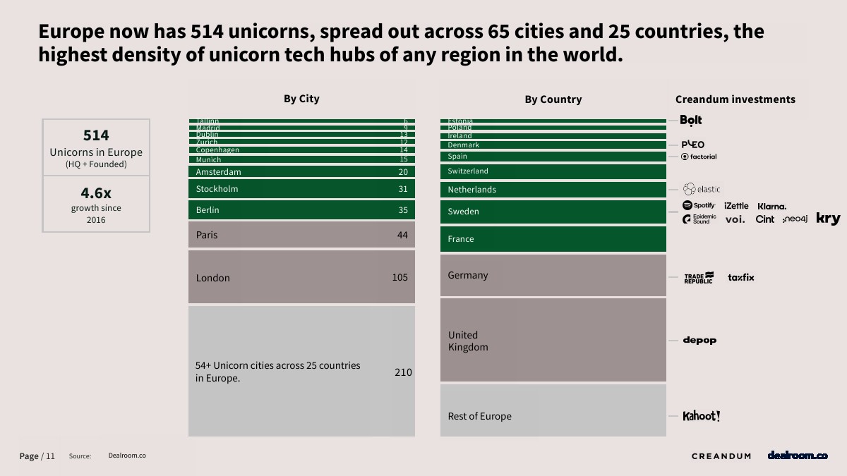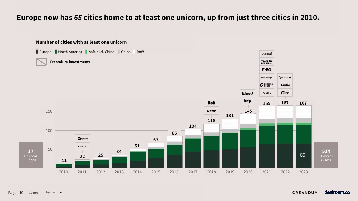 欧洲现在有65个城市拥有至少一家独角兽企业,而2010年只有3个城市。