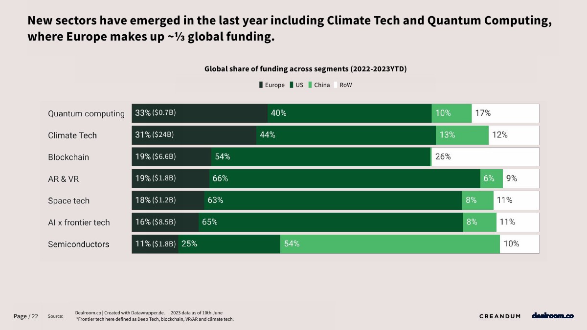 去年出现了新的领域,包括气候技术和量子计算,欧洲占全球资金的约1/3。