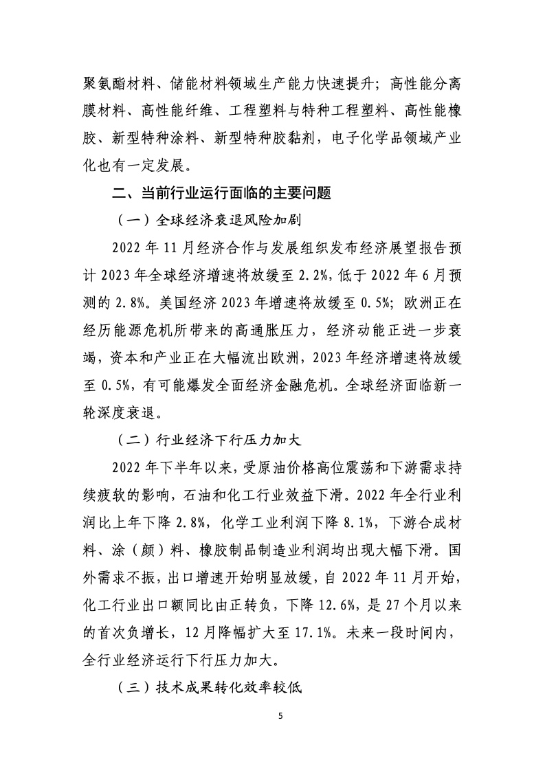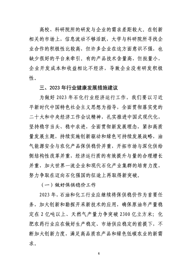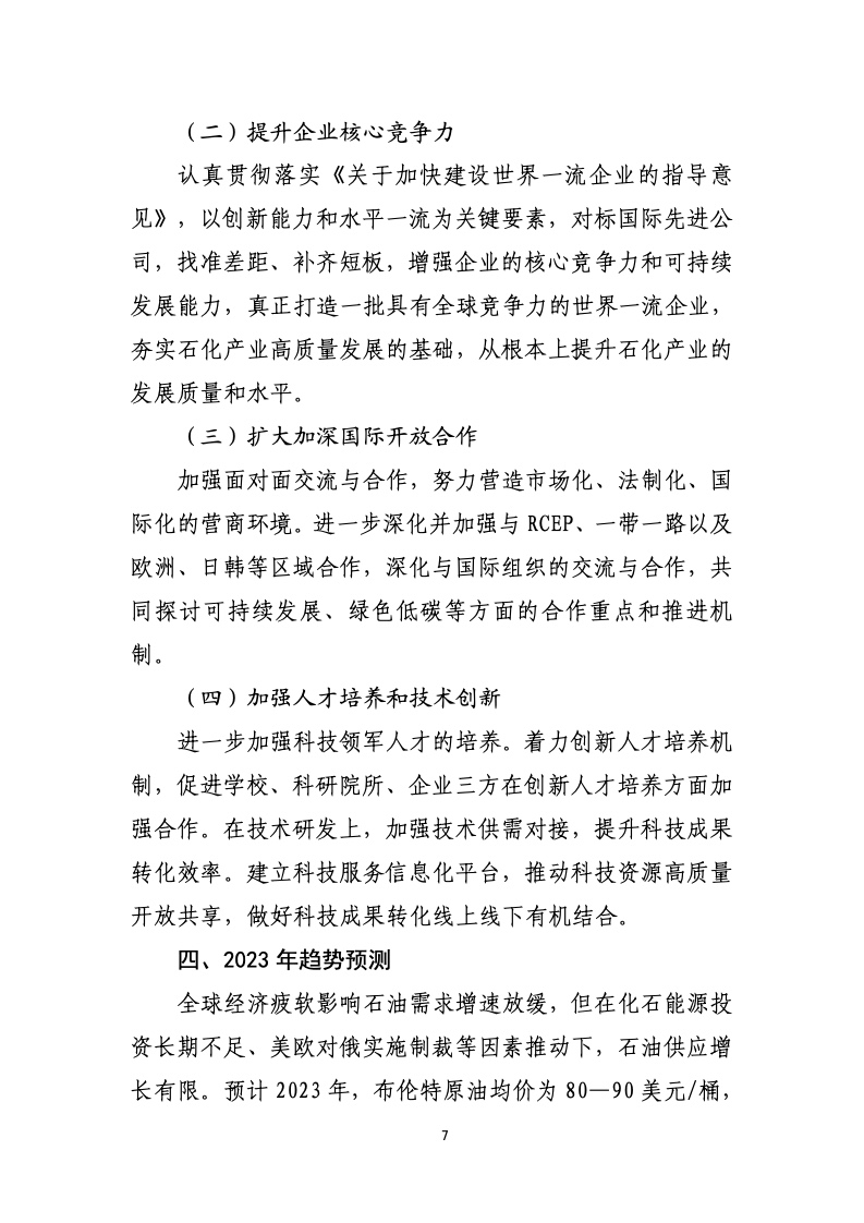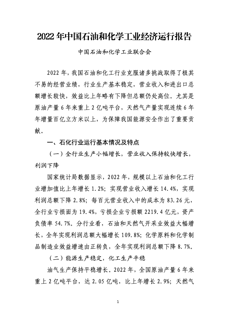 国家统计局数据显示,2022 年,规模以上石油和化工行业增加值比上年增长 1.2%;实现营业收入增长14.4%,实现利润总额下降 2.8%;每百元营业收入中的成本为83.26元,全行业亏损面为 19.4%,亏损企业亏损额2219.4 亿元,资产负债率 54.7%。分行业看,石油和天然气开采业效益大幅增长,全年实现利润总额大幅增长109.8%;化学原料和化学制品制造业效益增速由正转负,全年实现利润总额下降8.7%。