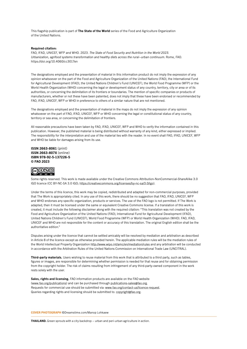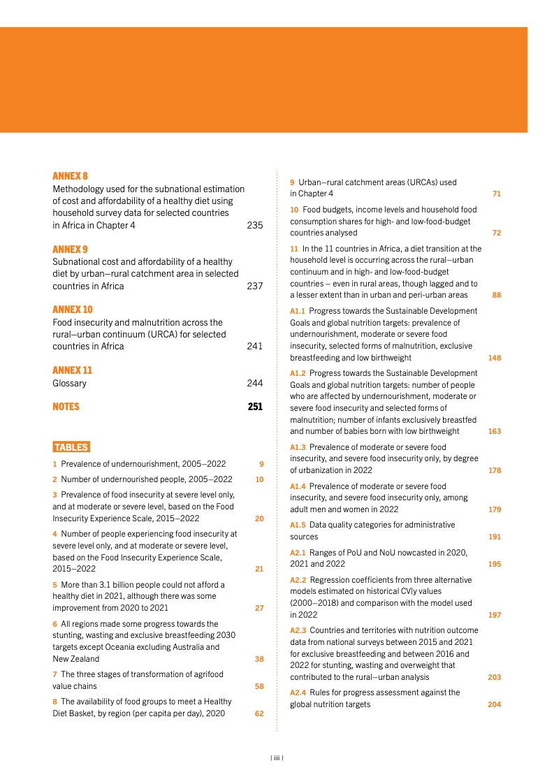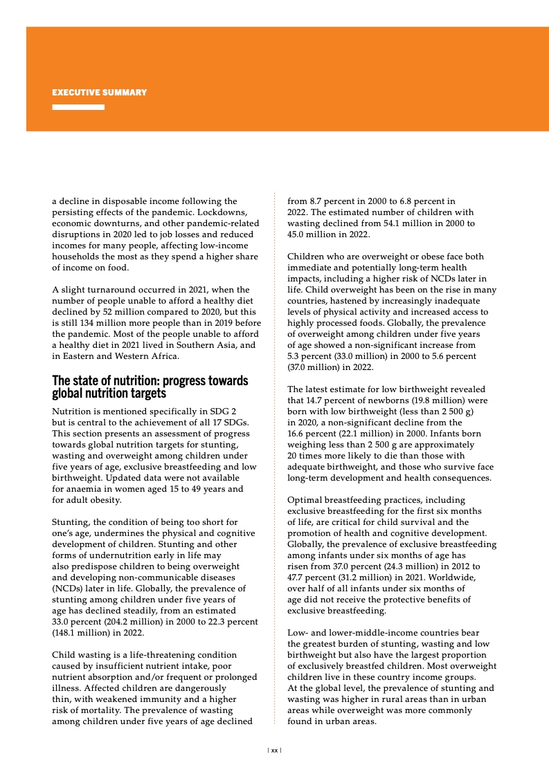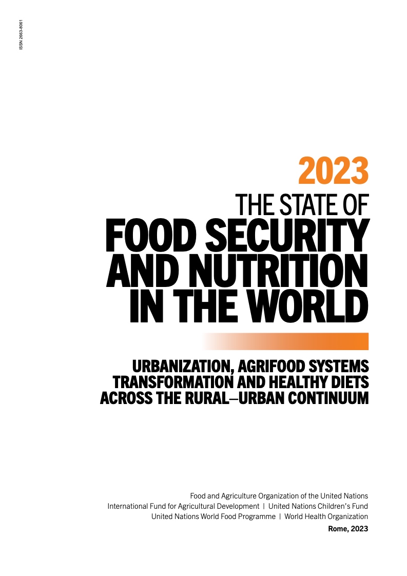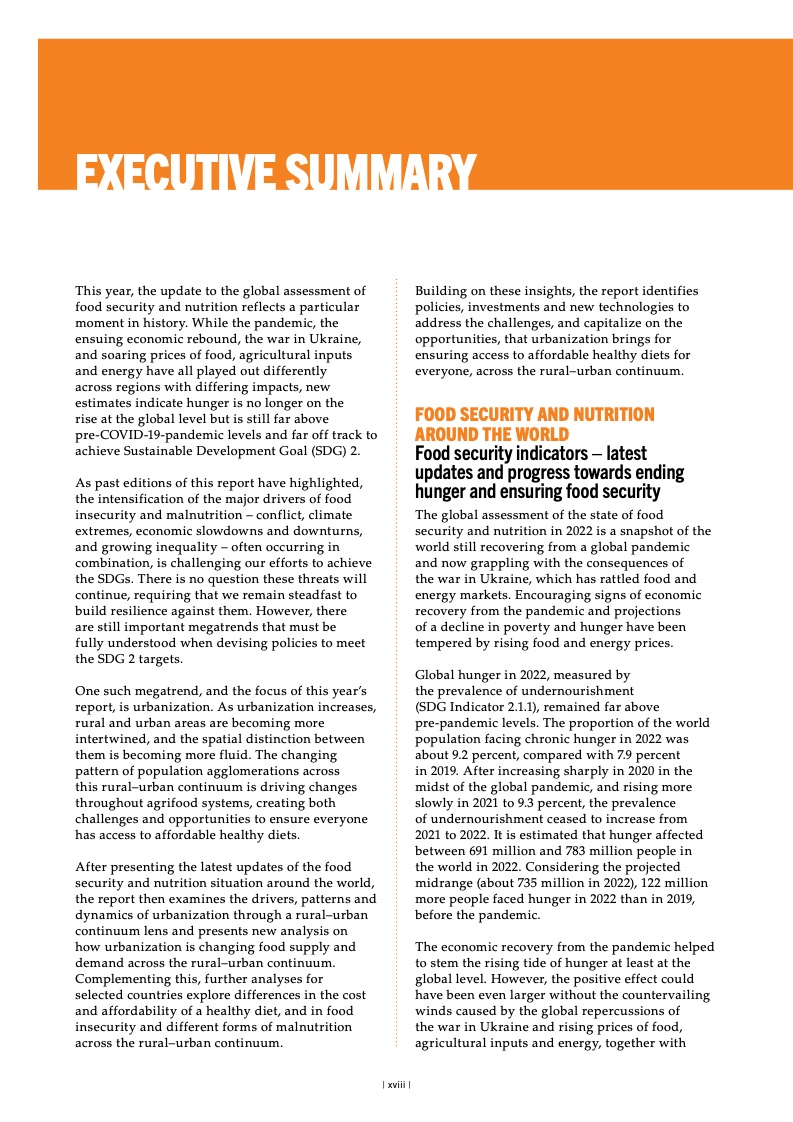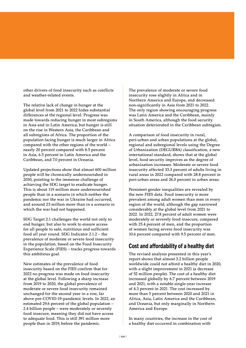 2019 至 2020 年间,全球中度或重 度粮食不安全发生率(可持续发展目 标指标 2.1.2)一度飙升,现已连续 第二年维持不变。2022 年,24 亿人 处于中度或重度粮食不安全状况,约 占全世界人口的 29.6%,其中约有 9 亿人深陷重度粮食不安全状况,占全 世界人口的 11.3%。