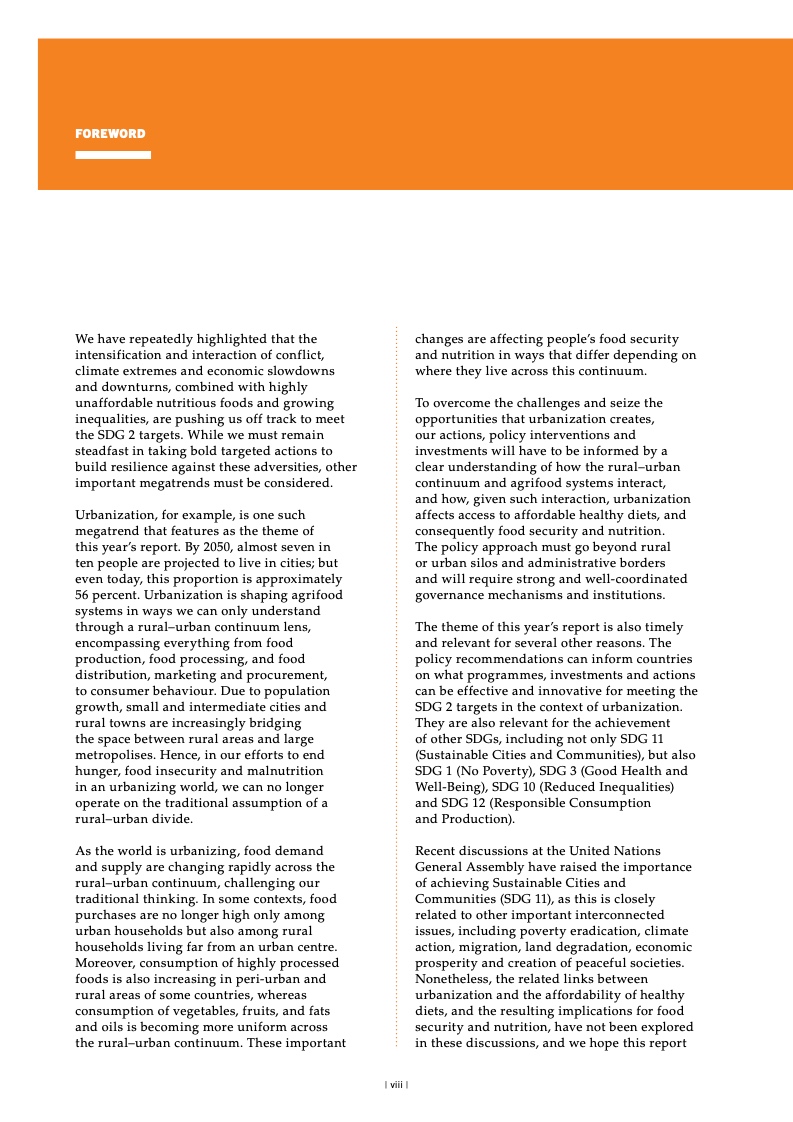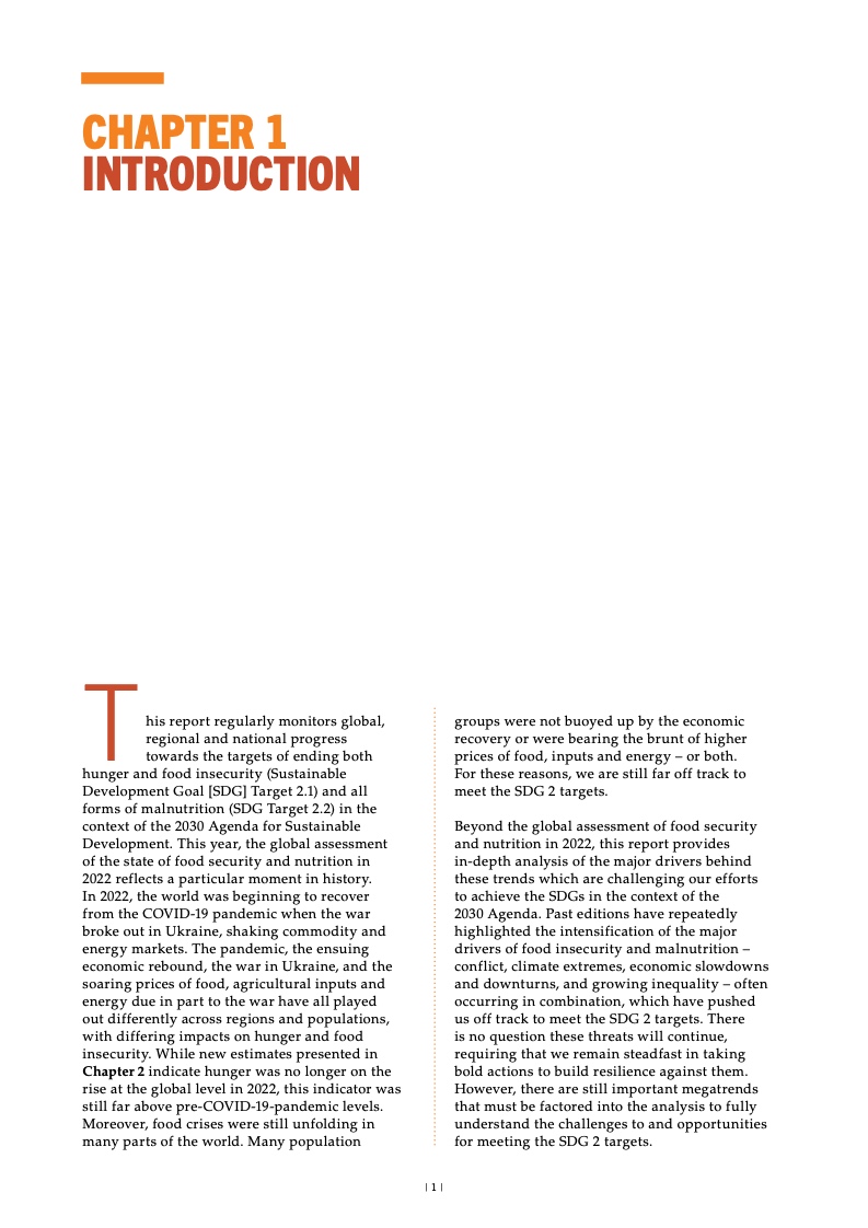 到 2030 年,全世界预计有近 6 亿 人长期食物不足。由于疫情和乌克兰 战争,将有约 1.19 亿人陷入这种困 境,其中因乌克兰战争,将有约 2300 万人处于长期食物不足状况。因此, 全世界在实现可持续发展目标关于消 除饥饿的具体目标方面挑战巨大,其 中非洲的形势尤其严峻。