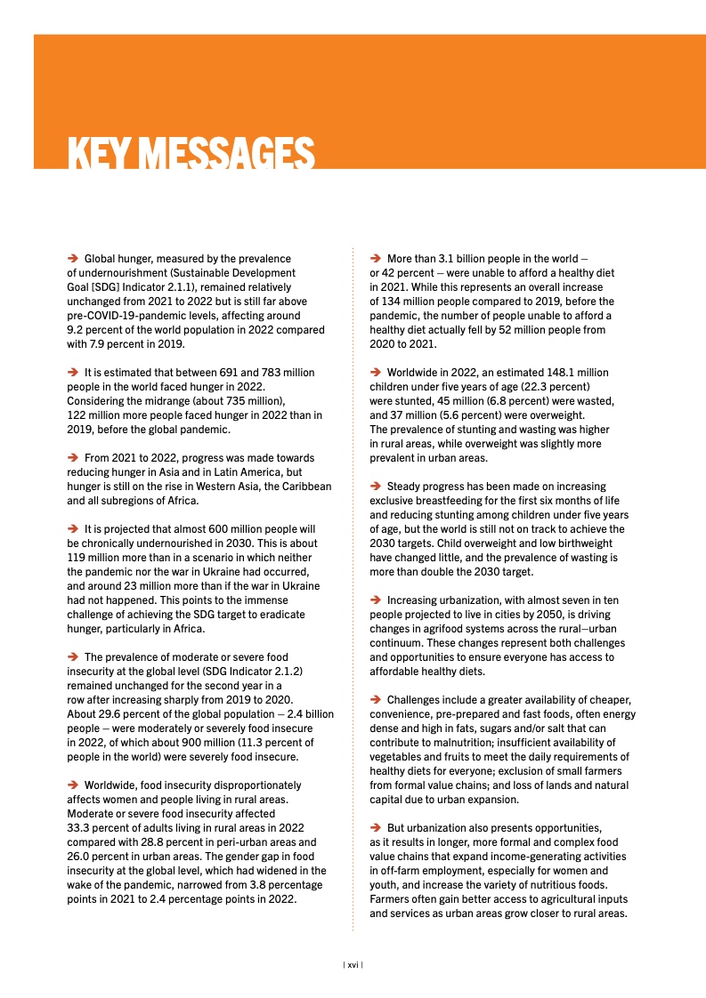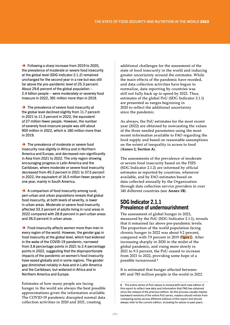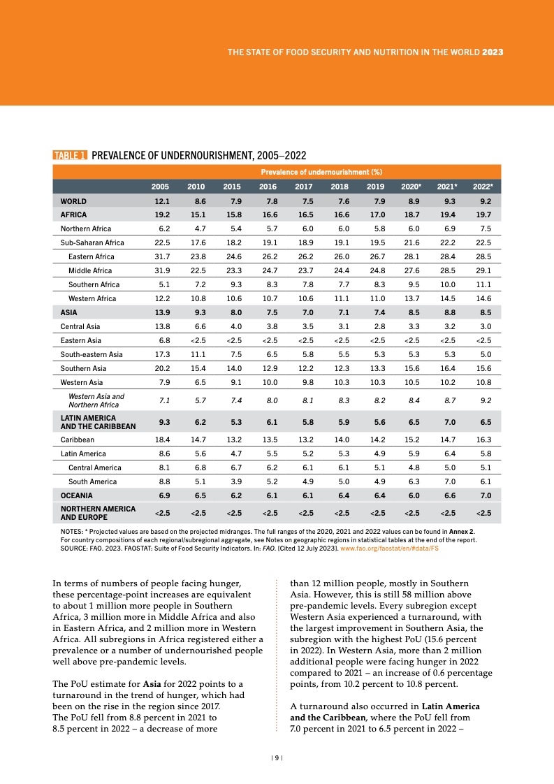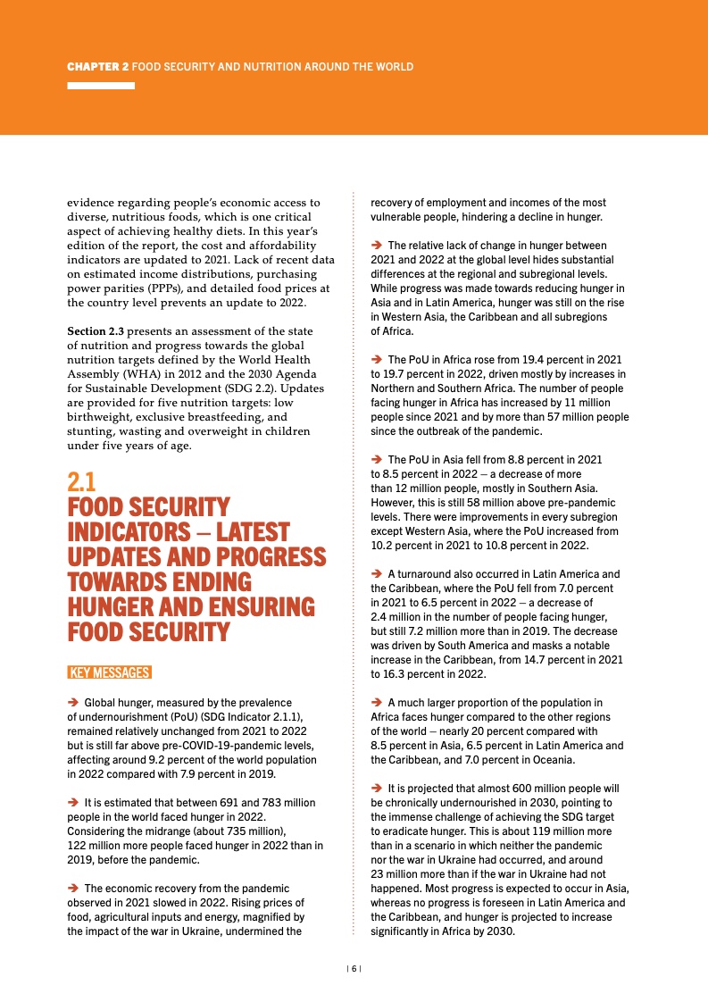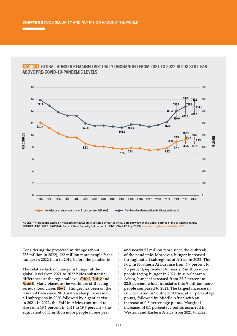 按照食物不足发生率(可持续发展 目标指标 2.1.1)衡量,2021 至 2022 年间全球饥饿状况相对维持不变,但 仍远高于 2019 冠状病毒病(COVID-19) 疫情暴发前水平。2022 年全球约有 9.2% 的人口受此影响,高于 2019 年的 7.9%。