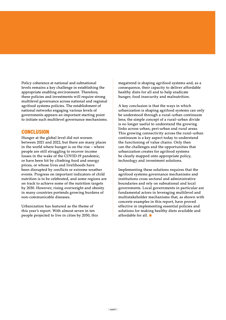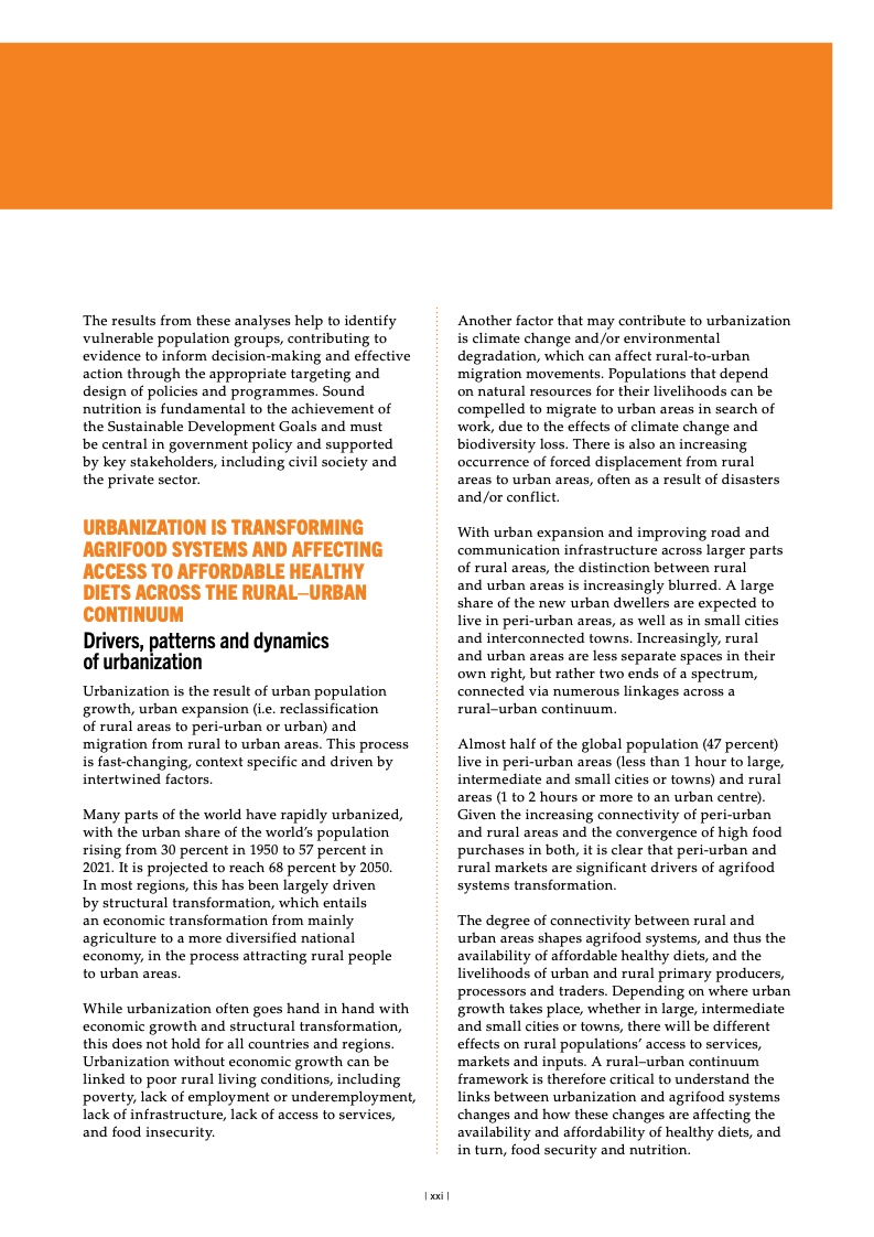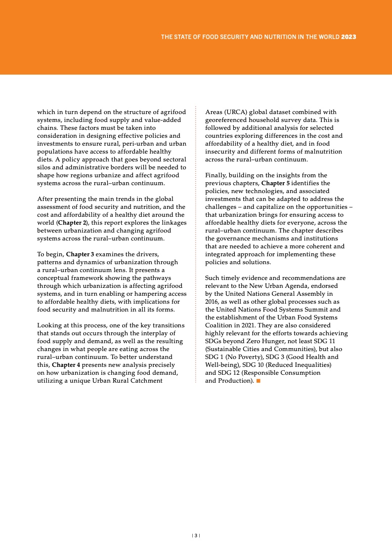 纵观全球,面对粮食不安全,女 性和农村地区居民首当其冲。2022 年, 中度或重度粮食不安全影响农村地区 33.3% 的成年居民,城郊和城市地区 的比例分别为 28.8% 和 26.0%。疫情 暴发后,全球粮食不安全方面的性别 差距进一步扩大,但已从 2021 年的 3.8 个百分点缩小到 2022 年的 2.4 个 百分点。