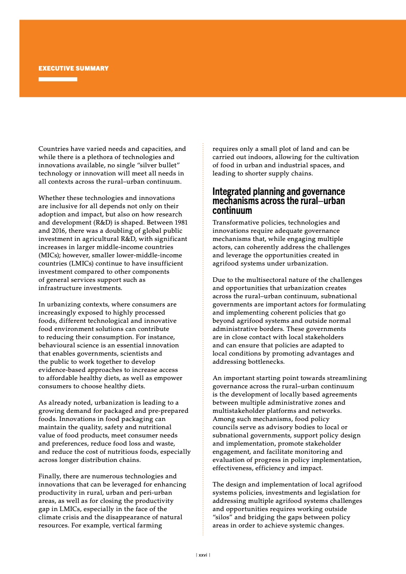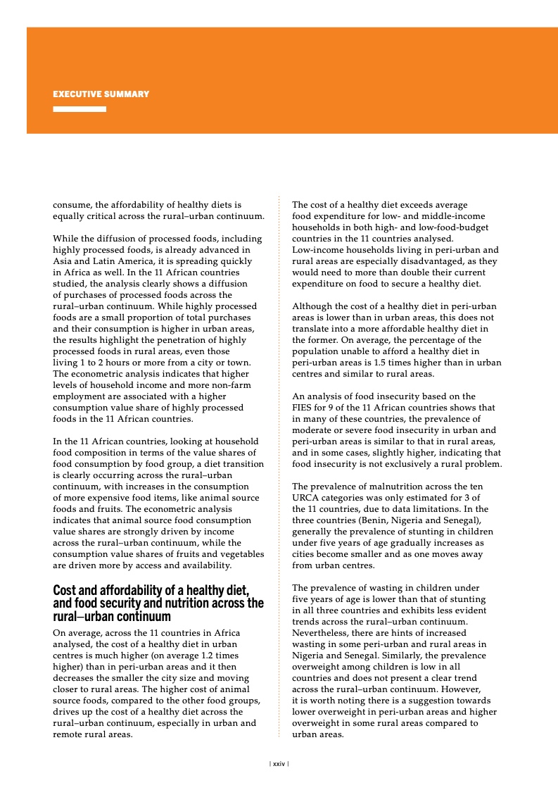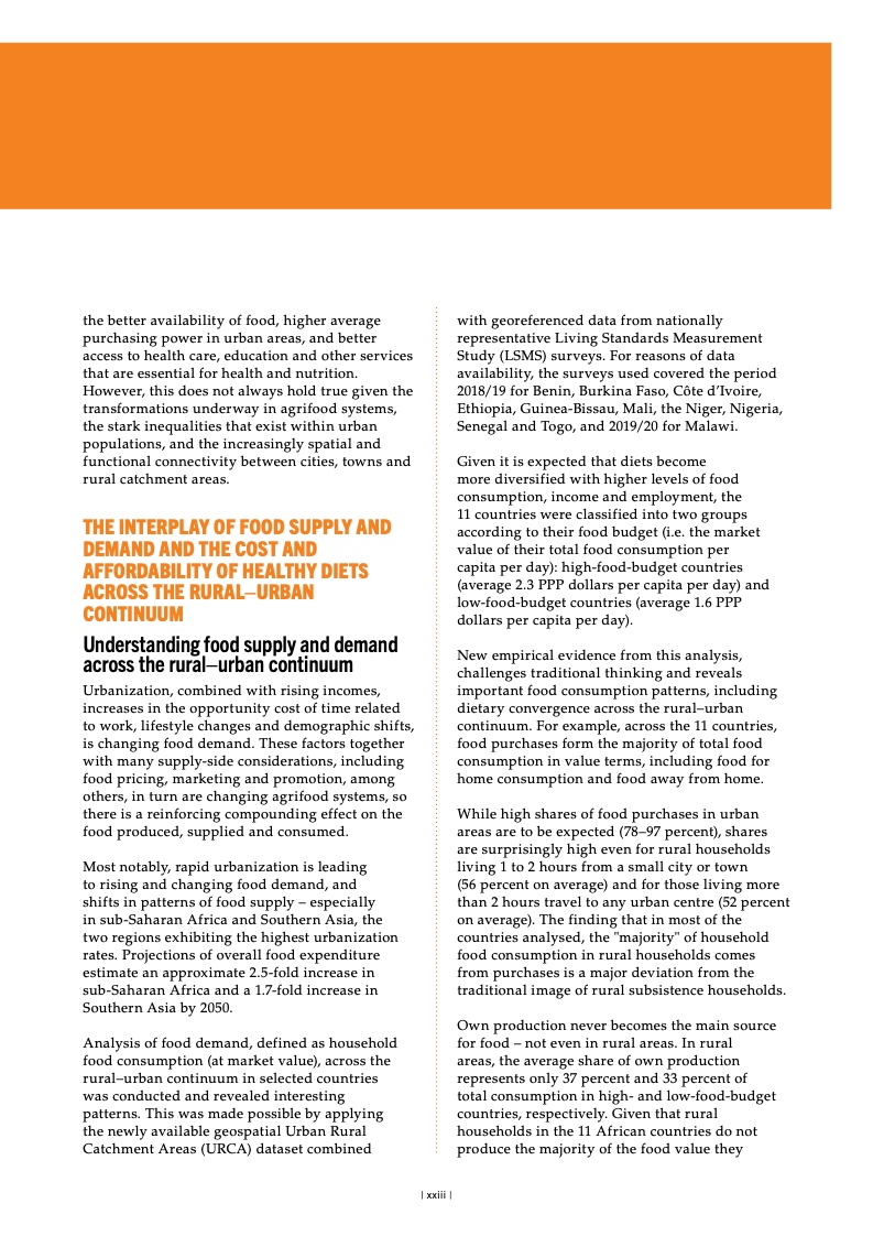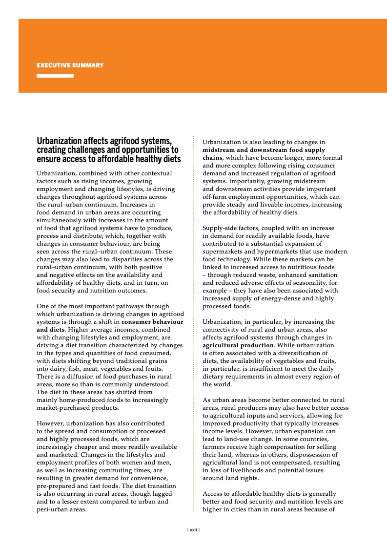 纵观全球,面对粮食不安全,女 性和农村地区居民首当其冲。2022 年, 中度或重度粮食不安全影响农村地区 33.3% 的成年居民,城郊和城市地区 的比例分别为 28.8% 和 26.0%。疫情 暴发后,全球粮食不安全方面的性别 差距进一步扩大,但已从 2021 年的 3.8 个百分点缩小到 2022 年的 2.4 个 百分点。