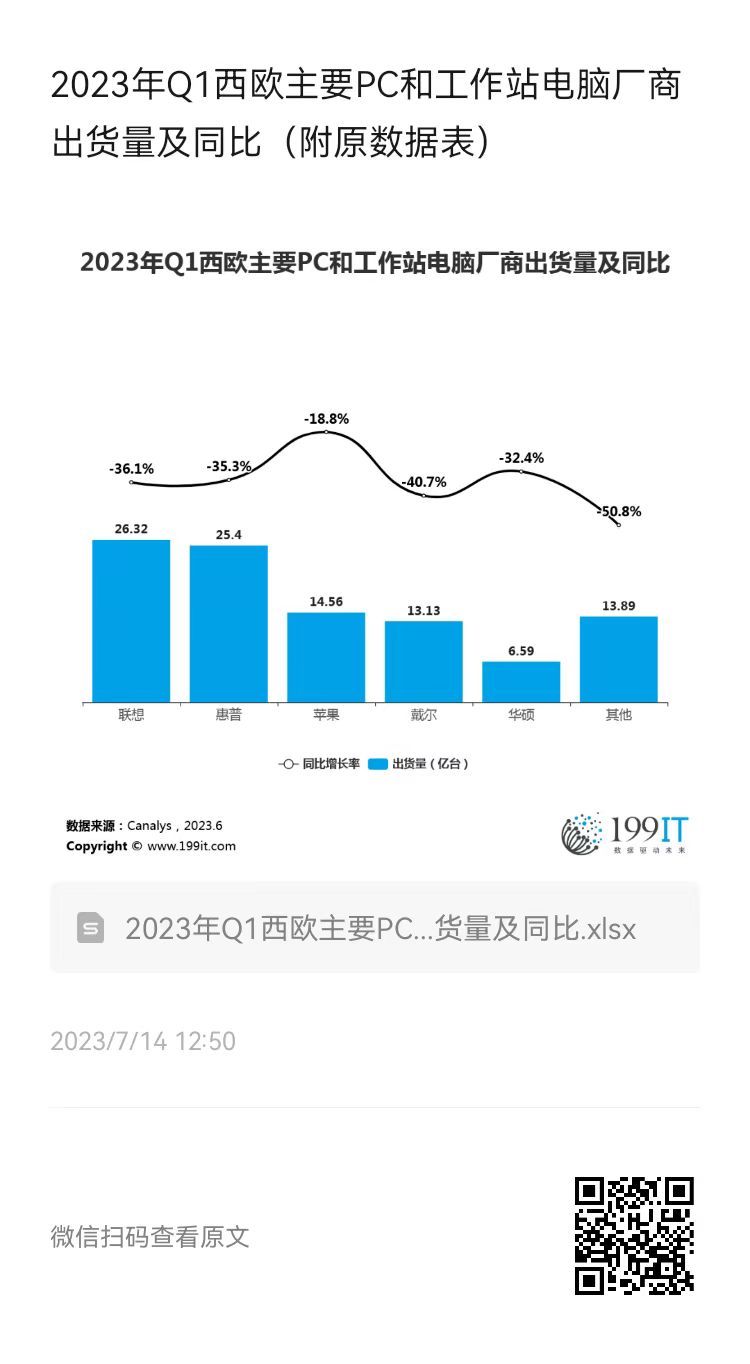 2023年Q1西欧主要PC和工作站电脑厂商出货量及同比(附原数据表) ​​​