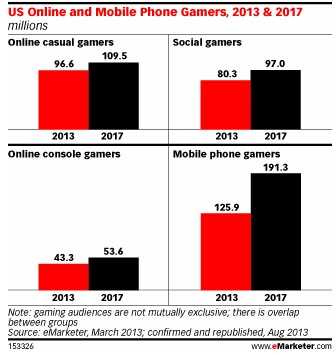 调查机构Newzoo数据显示,美国移动游戏用户数从之前的7500万已增至1.01亿,已超越传统游戏玩家,其中智能手机玩家占了69%,平板电脑玩家则是21%。而从eMarketer的数据来看至2016年,在美国智能手机用户中,游戏玩家数量占比将达到80%以上,成为美国游戏市场上的最大群体。