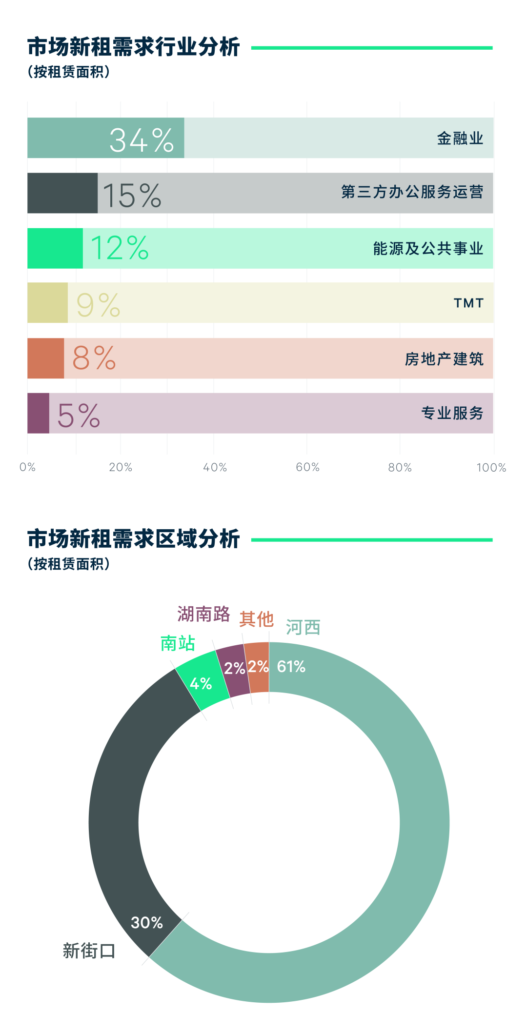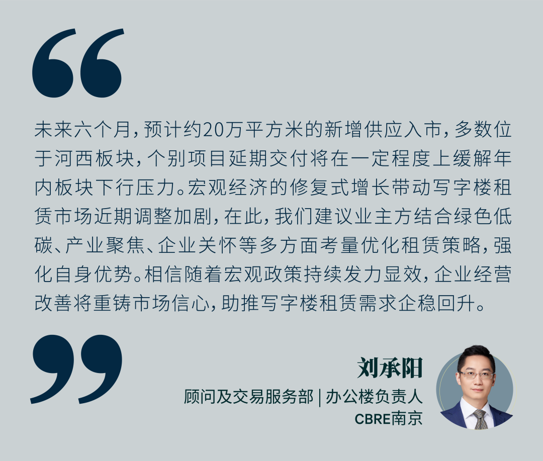 需求方面,金融业以银行及保险机构为引领释放稳定租赁需求。河西板块金融能级不断提升,广泛吸纳银行、保险及证券公司等大面积搬迁需求,而基金与普惠金融类新兴业态呈现多板块分布态势,在新街口、南站、湖南路等区域亦录得成交。市场修复加剧需求动能更迭,第三方办公服务运营商积极扩张,跃居第二。本土商业空间运营品牌紧抓核心板块租金窗口期锁定成本优势,连续两个季度录得新设点位。此外,新能源及环保相关产业竞争力增强,驱动能源及公共事业类企业升级需求保持坚挺;电商与平台互联网公司为首的科技企业租赁需求于河西及南站等板块持续放量。